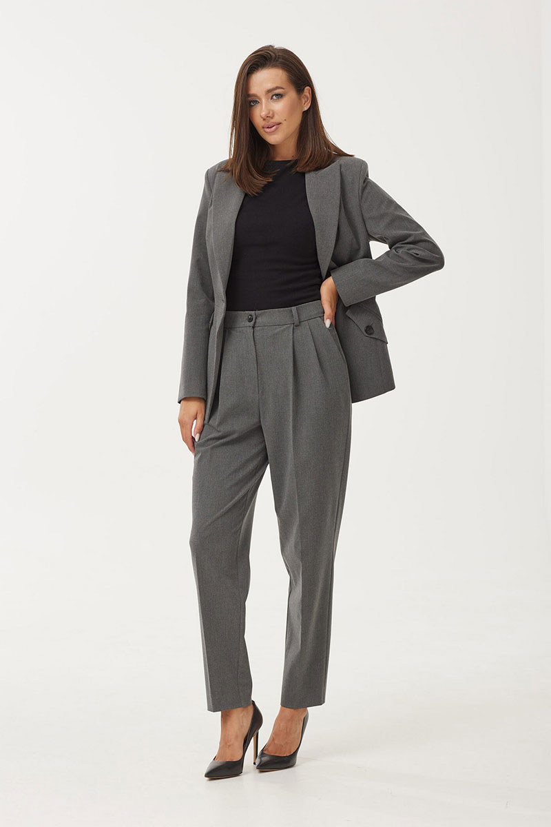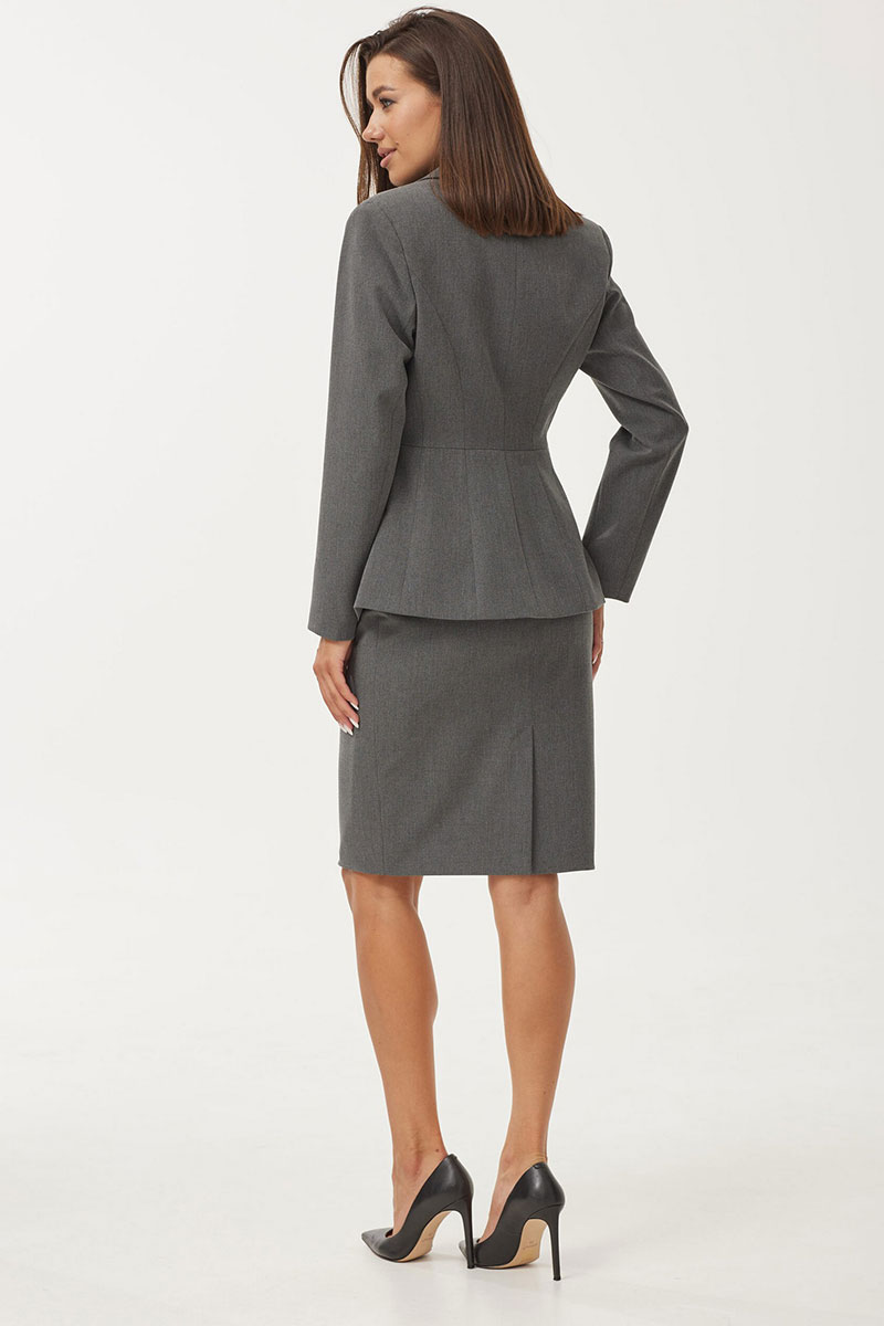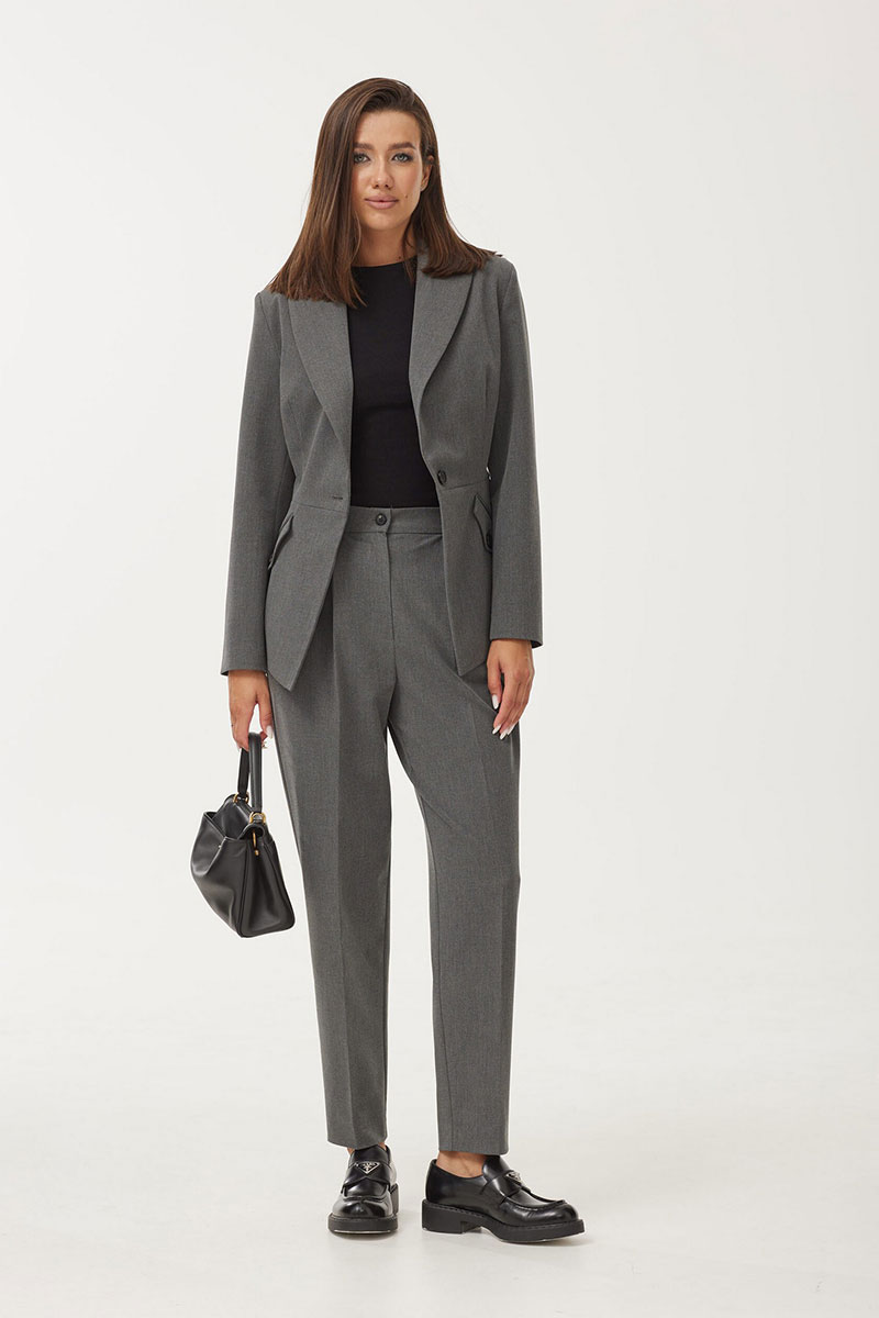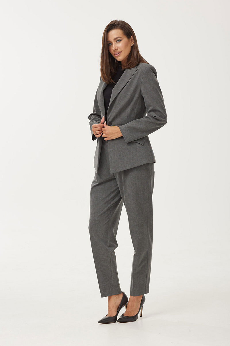 Жакет женский прилегающего силуэта, выполненный из костюмной ткани. Жакет с отрезной талией. Застежка однобортная на одну петлю и пуговицу. Воротник пиджачный с лацканами. Карманы прорезные по косой линии, с клапанами. Рукава втачные длинные. Спинка со средним швом и талиевыми вытачками.