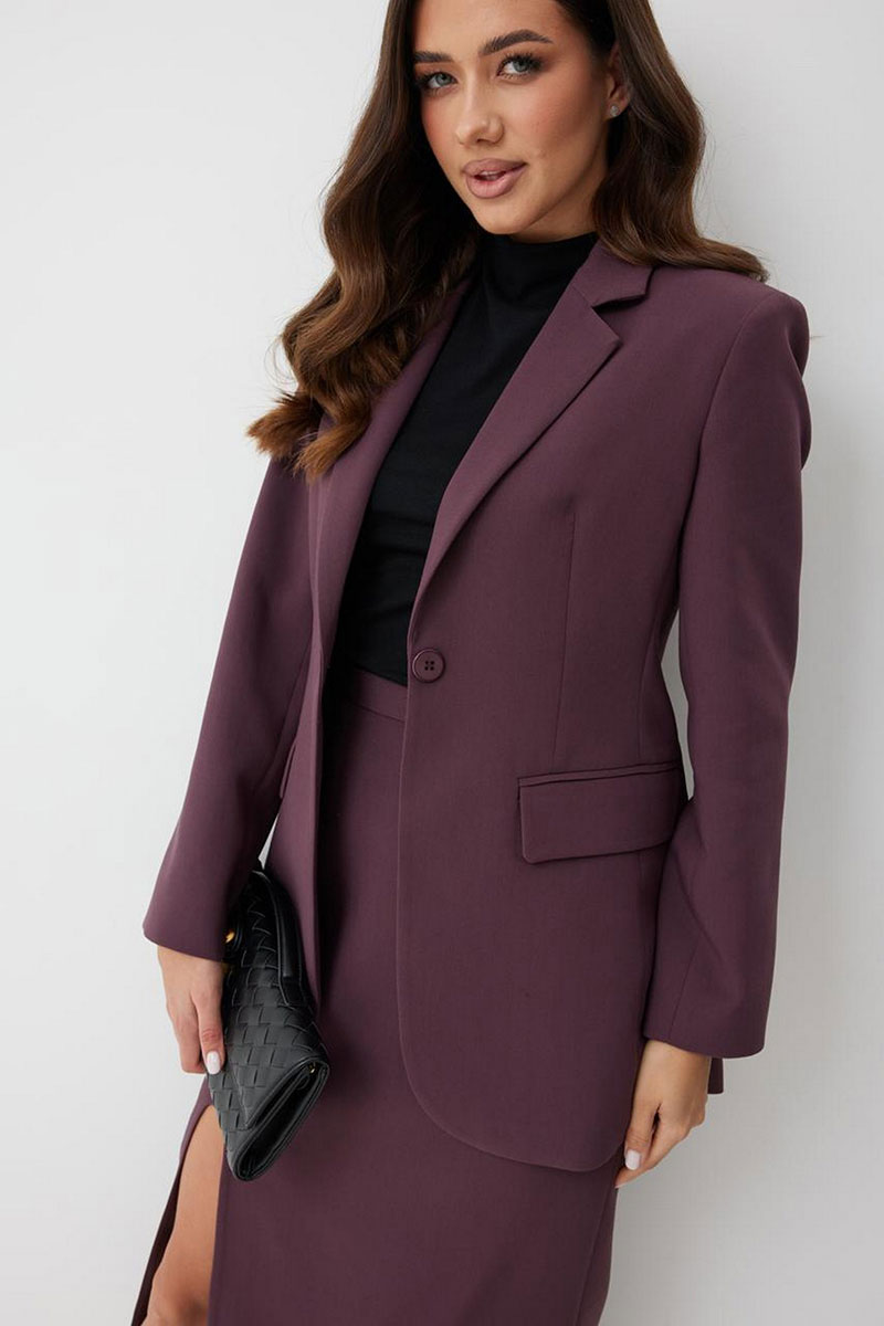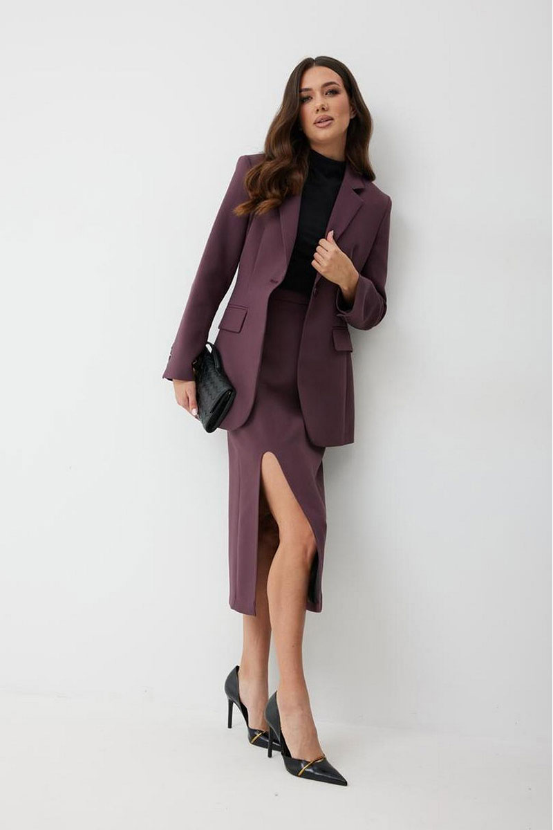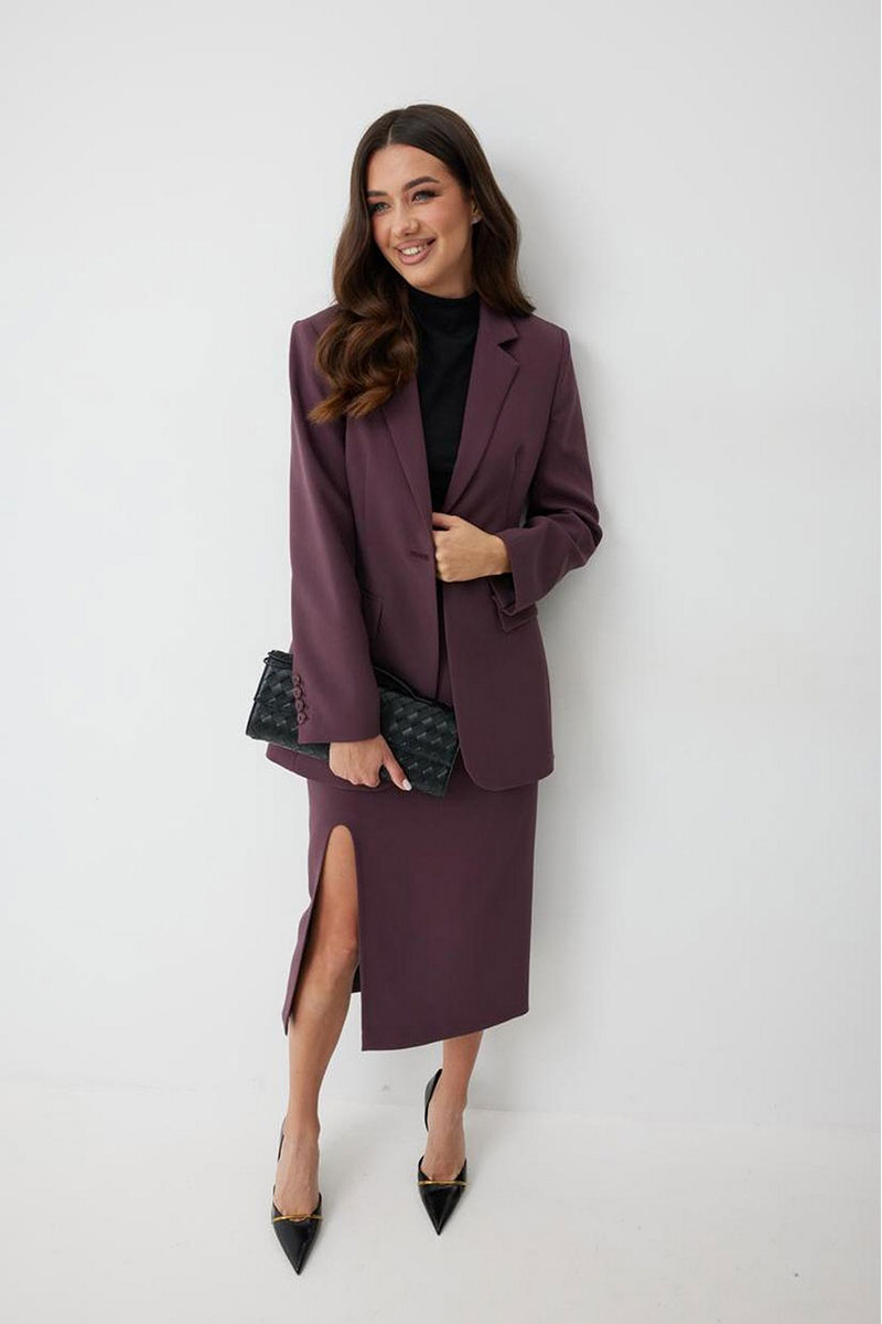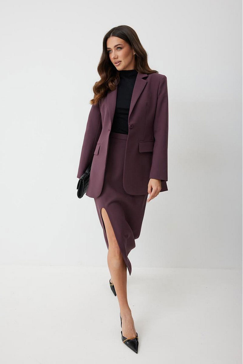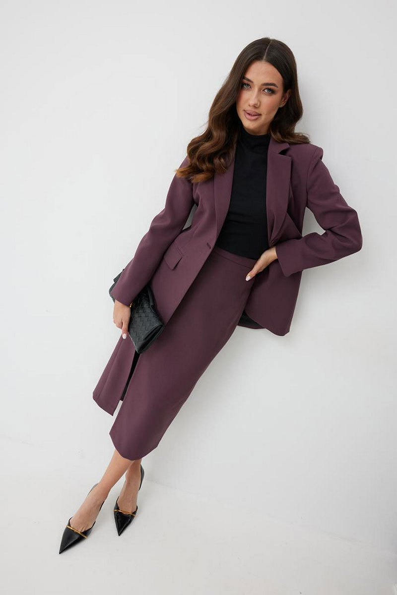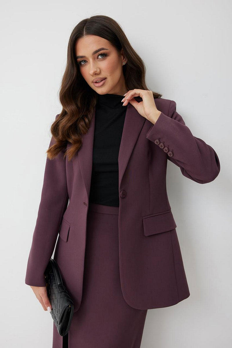 Центральная однобортная застежка на одну петлю и пуговицу придает лаконичность. Классический пиджачный воротник с лацканами и изящный V-образный вырез создают строгий, женственный образ. По полочке функциональные прорезные карманы с клапанами. Рукава втачные длинные, двух шовные, со шлицей и застежкой на пуговицы снизу. Спинка жакета со средним швом, внизу которого шлица. Этот жакет безупречно сочетается с юбкой М371.