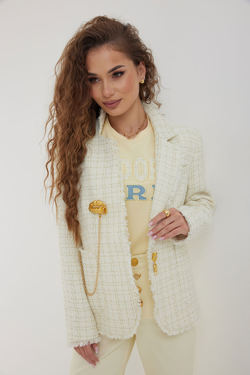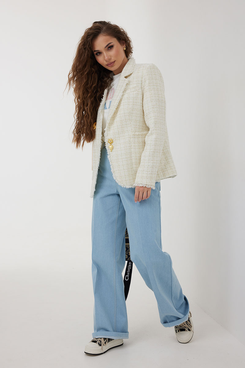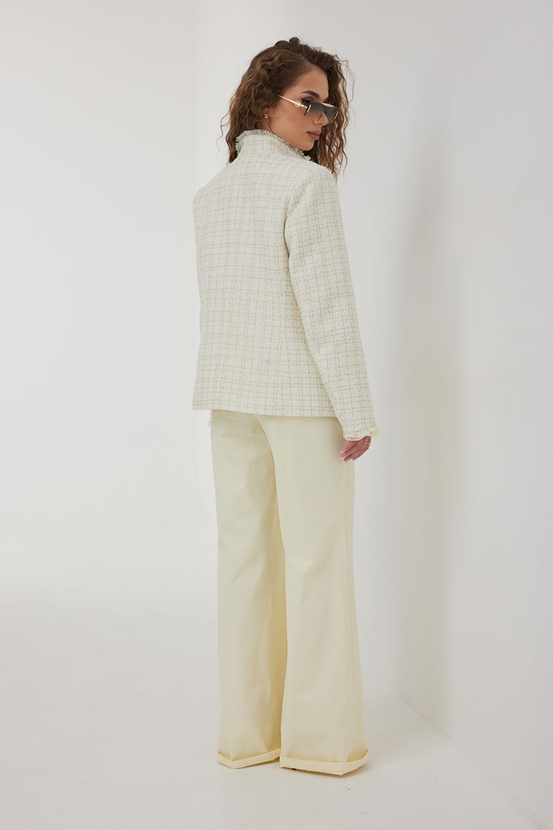 Жакет из полотна «рогожка», полуприлегающего силуэта, с центральной застежкой на одну петлю и декоративную пуговицу. Перед с нагрудной вытачкой и накладным карманом. Спинка с отрезным бочком, средним швом. Воротник ассиметричный. Слева - пиджачный, справа- стойка. По краю борта, низу переда и рукава, входу в карман и отлету воротника вставлена бахрома. Жакет на подкладке с плечевыми накладками.