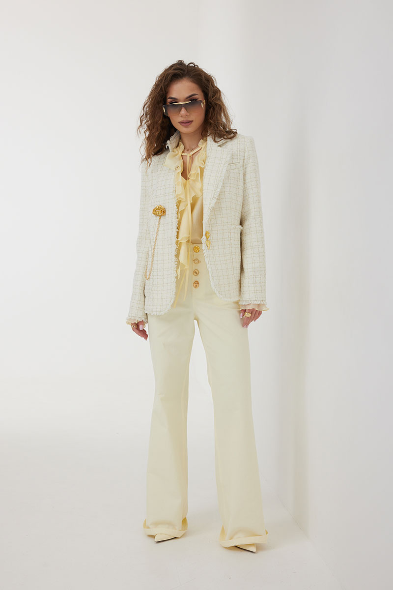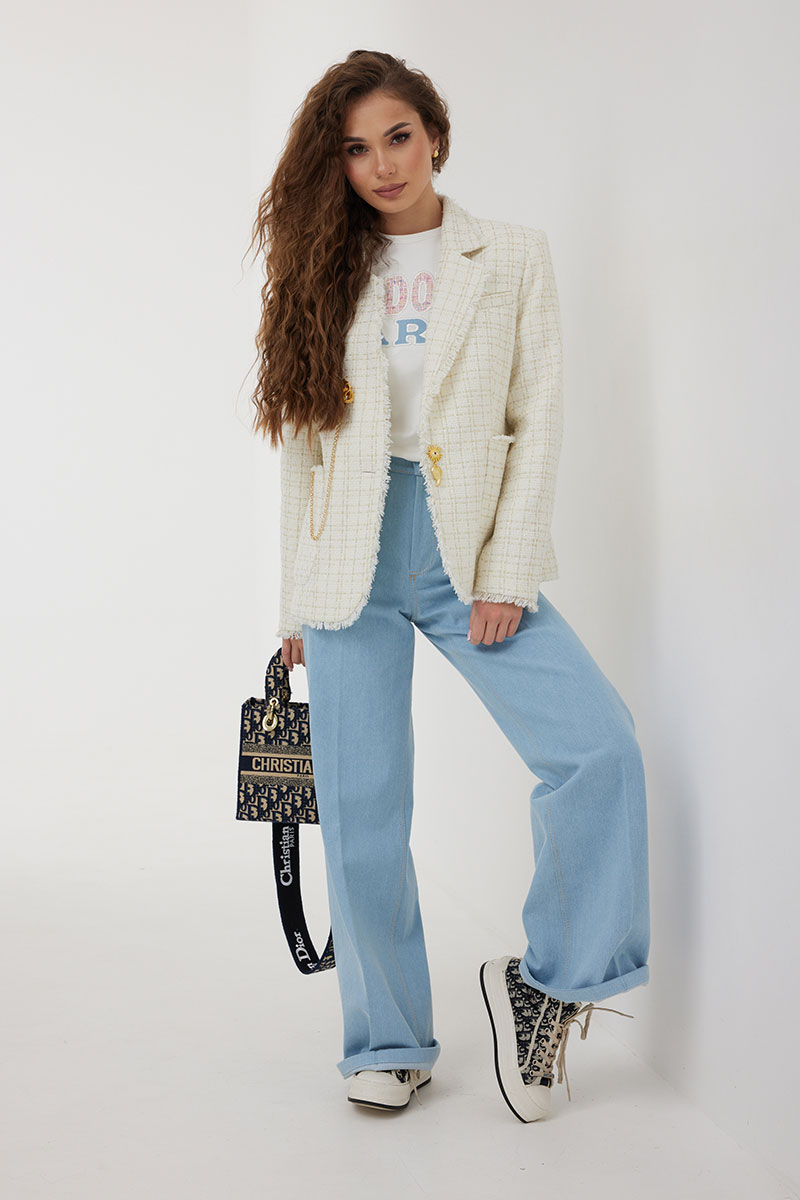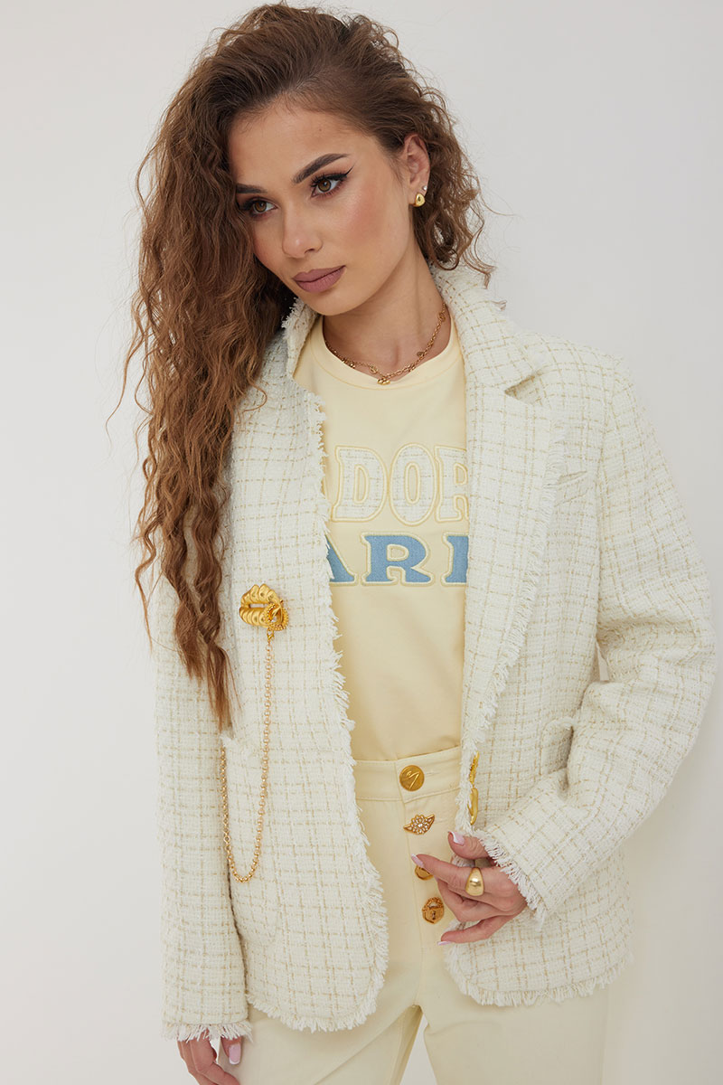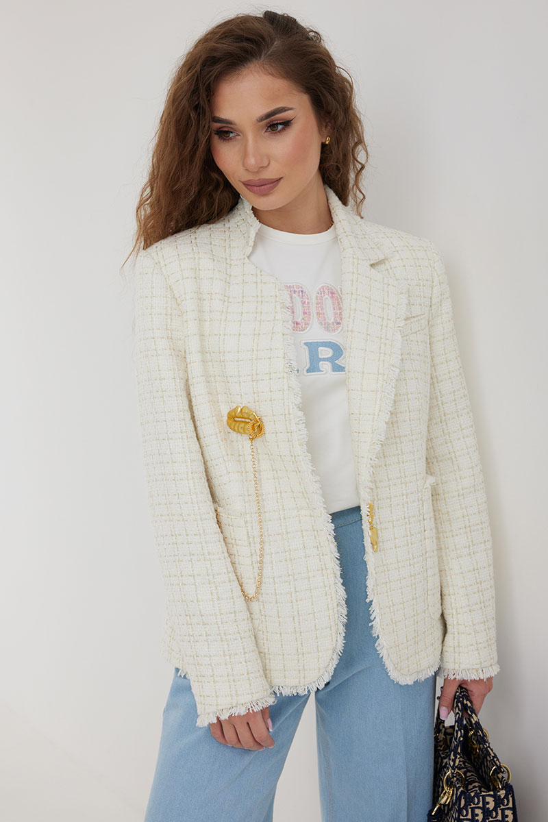 Жакет из полотна «рогожка», полуприлегающего силуэта, с центральной застежкой на одну петлю и декоративную пуговицу. Перед с нагрудной вытачкой и накладным карманом. Спинка с отрезным бочком, средним швом. Воротник ассиметричный. Слева - пиджачный, справа- стойка. По краю борта, низу переда и рукава, входу в карман и отлету воротника вставлена бахрома. Жакет на подкладке с плечевыми накладками.