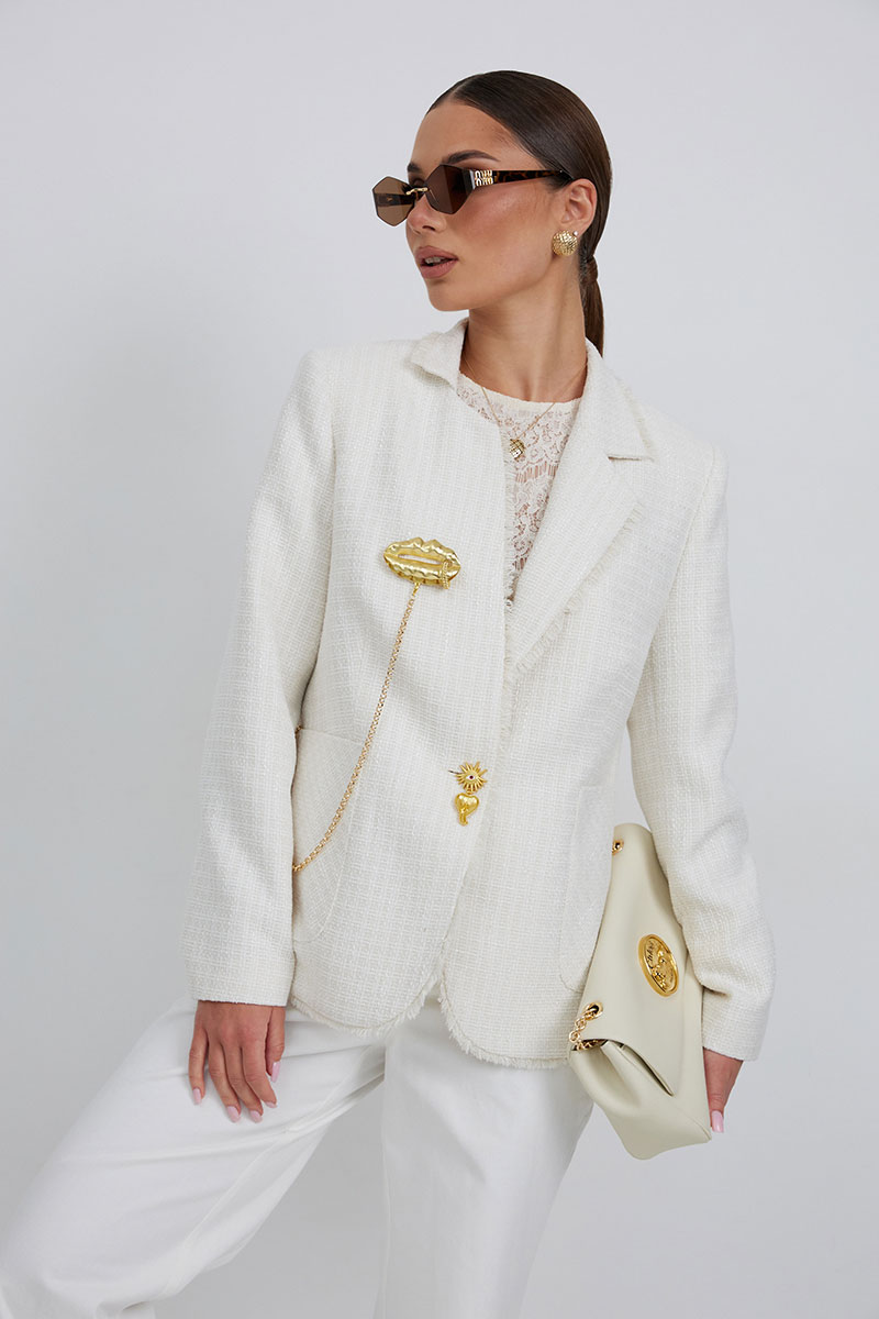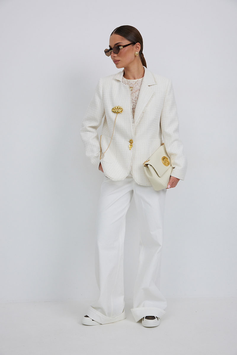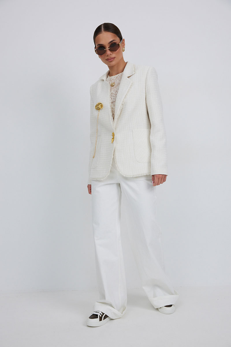 Жакет из полотна «рогожка», полуприлегающего силуэта, с центральной застежкой на одну петлю и декоративную пуговицу. Перед с нагрудной вытачкой и накладным карманом. Спинка с отрезным бочком, средним швом. Воротник ассиметричный. Слева - пиджачный, справа- стойка. По краю борта, низу переда и рукава, входу в карман и отлету воротника вставлена бахрома. Жакет на подкладке с плечевыми накладками.