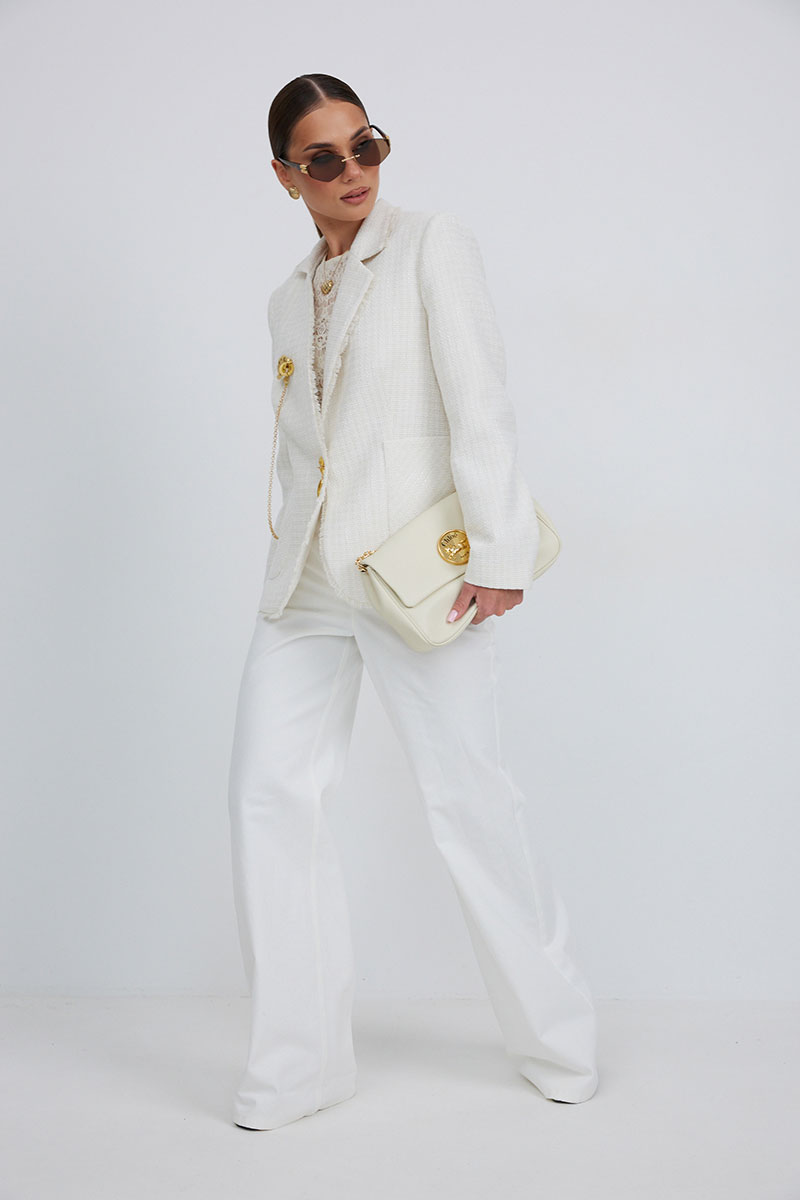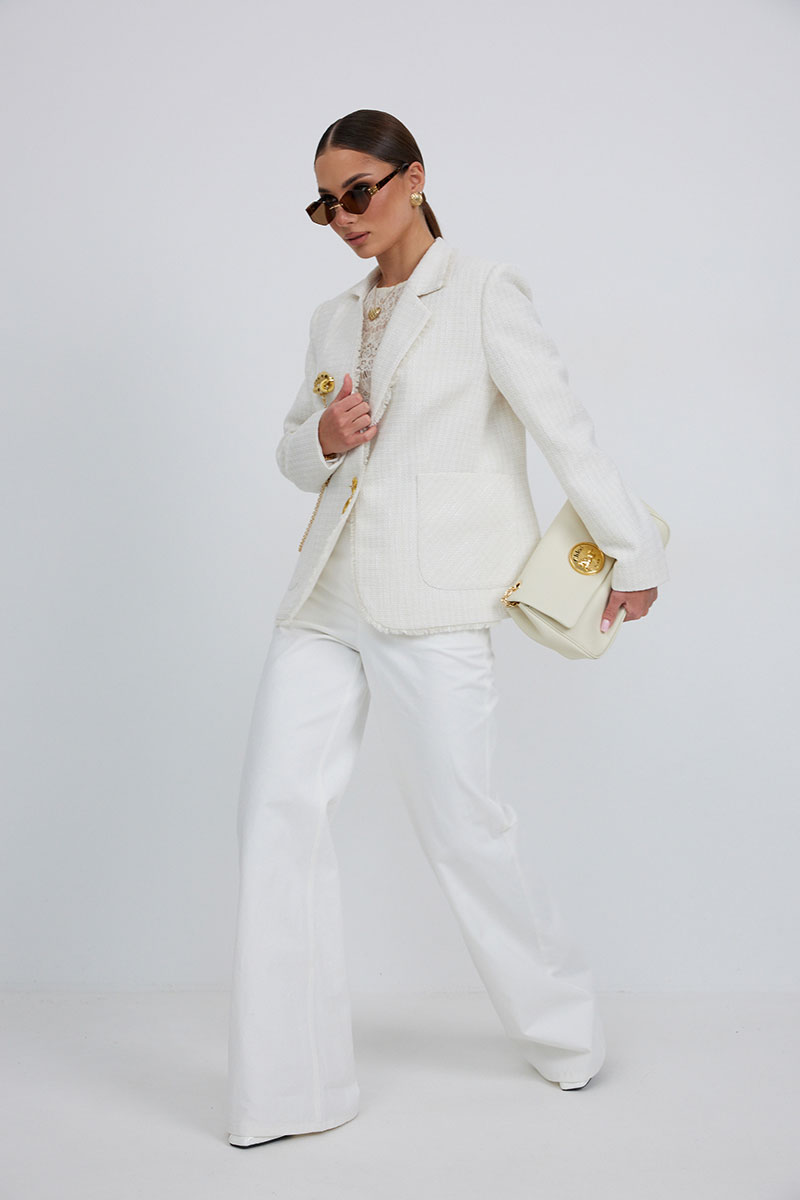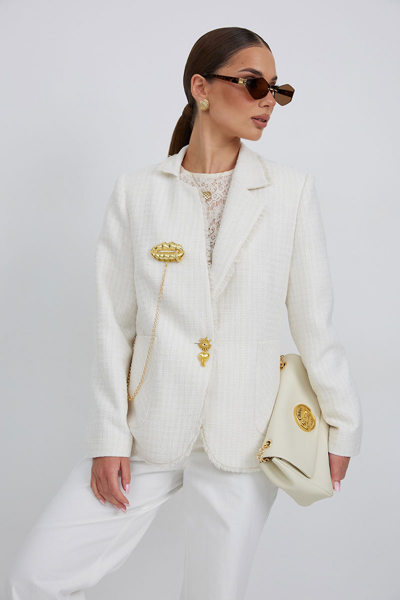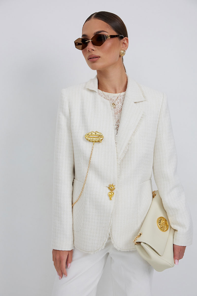 Жакет из полотна «рогожка», полуприлегающего силуэта, с центральной застежкой на одну петлю и декоративную пуговицу. Перед с нагрудной вытачкой и накладным карманом. Спинка с отрезным бочком, средним швом. Воротник ассиметричный. Слева - пиджачный, справа- стойка. По краю борта, низу переда и рукава, входу в карман и отлету воротника вставлена бахрома. Жакет на подкладке с плечевыми накладками.