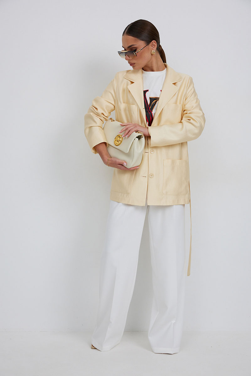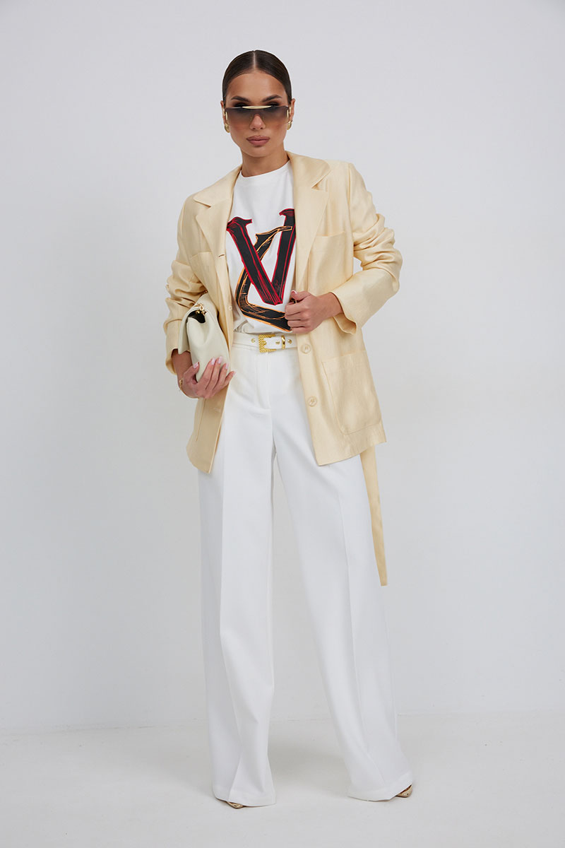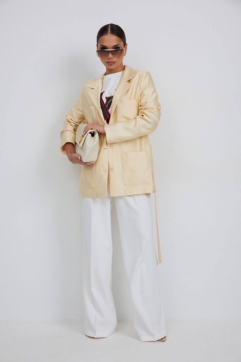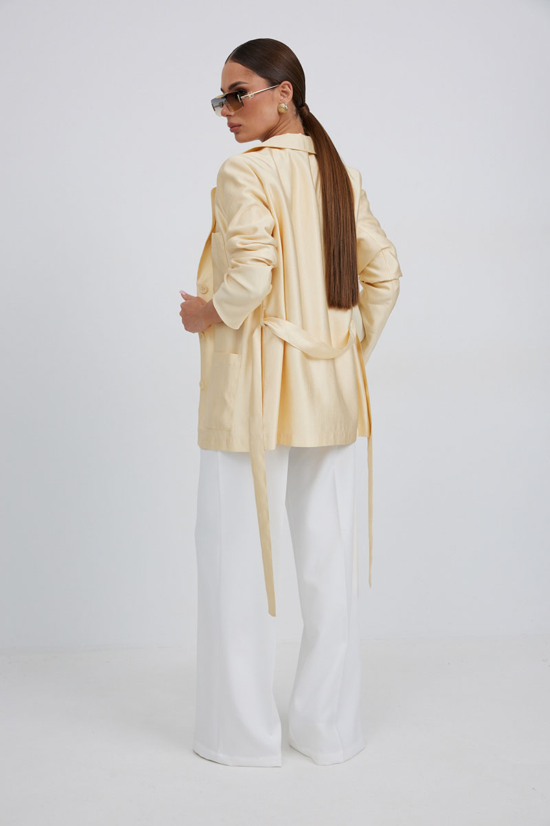 Жакет женский свободного силуэта, длиной ниже линии бедер, на подкладке, застежка центральная на петли и пуговицы. Перед с накладными карманами. Воротник пиджачный, с закругленными концами воротника и лацканов. Рукав длинный втачной двухшовный. В комплекте с жакетом пояс из основной ткани, завязывающийся спереди.
