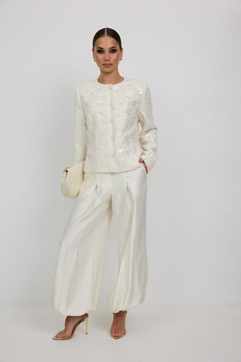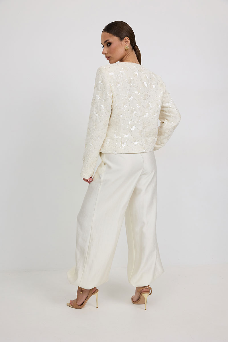 Жакет из твидовой ткани с вышивкой, полуприлегающего силуэта, с центральной застежкой на планку с петлями и пуговицами. Перед с отрезным бочком. Спинка с отрезным бочком, средним швом. Горловина округлой формы. Рукав втачной. Жакет на подкладке с плечевыми накладками.