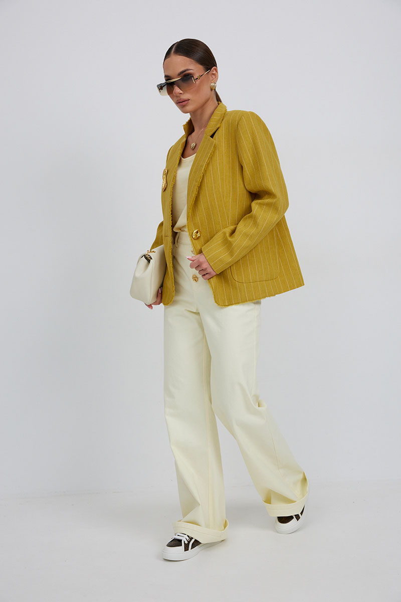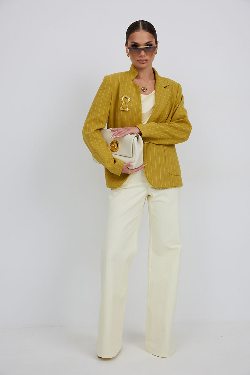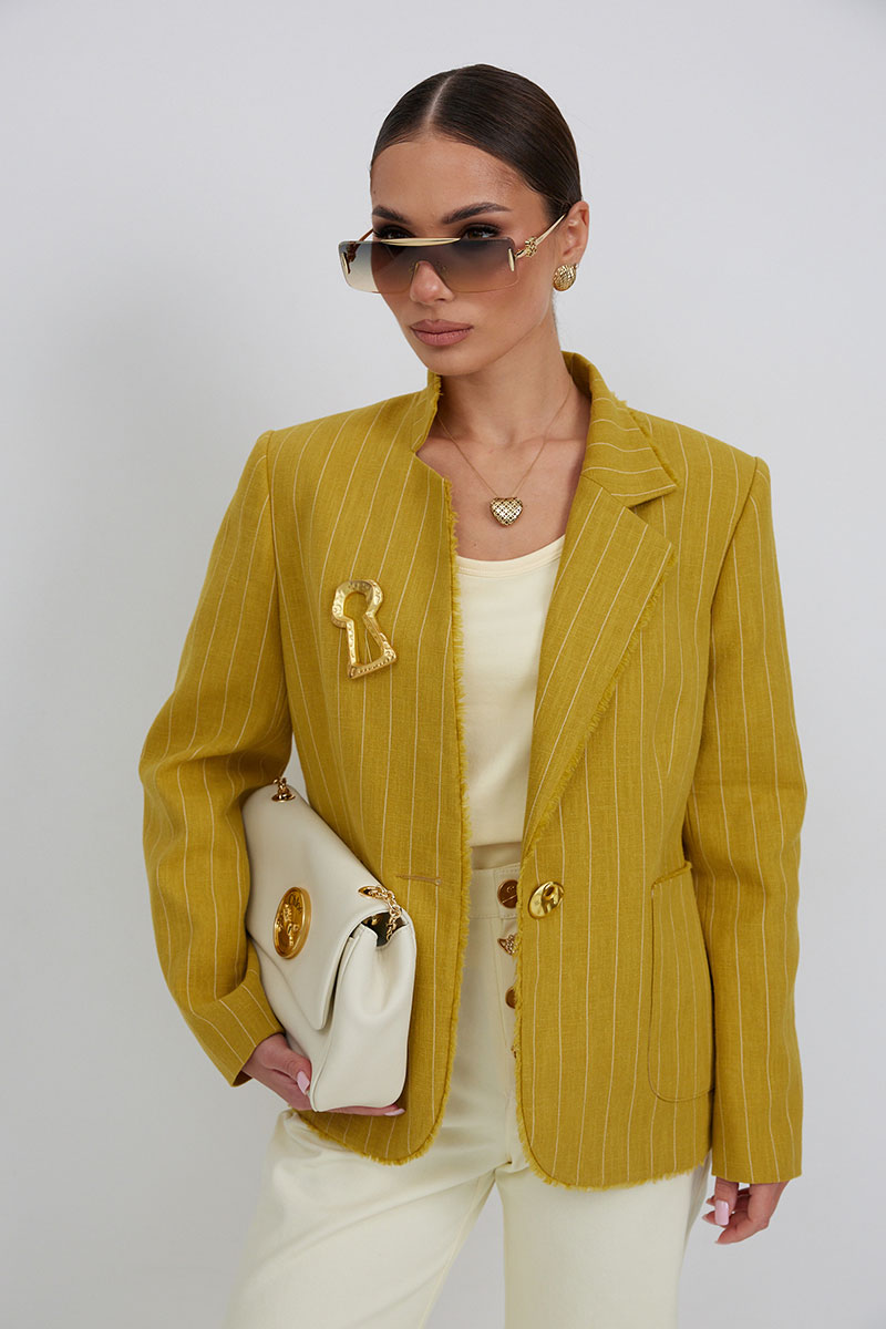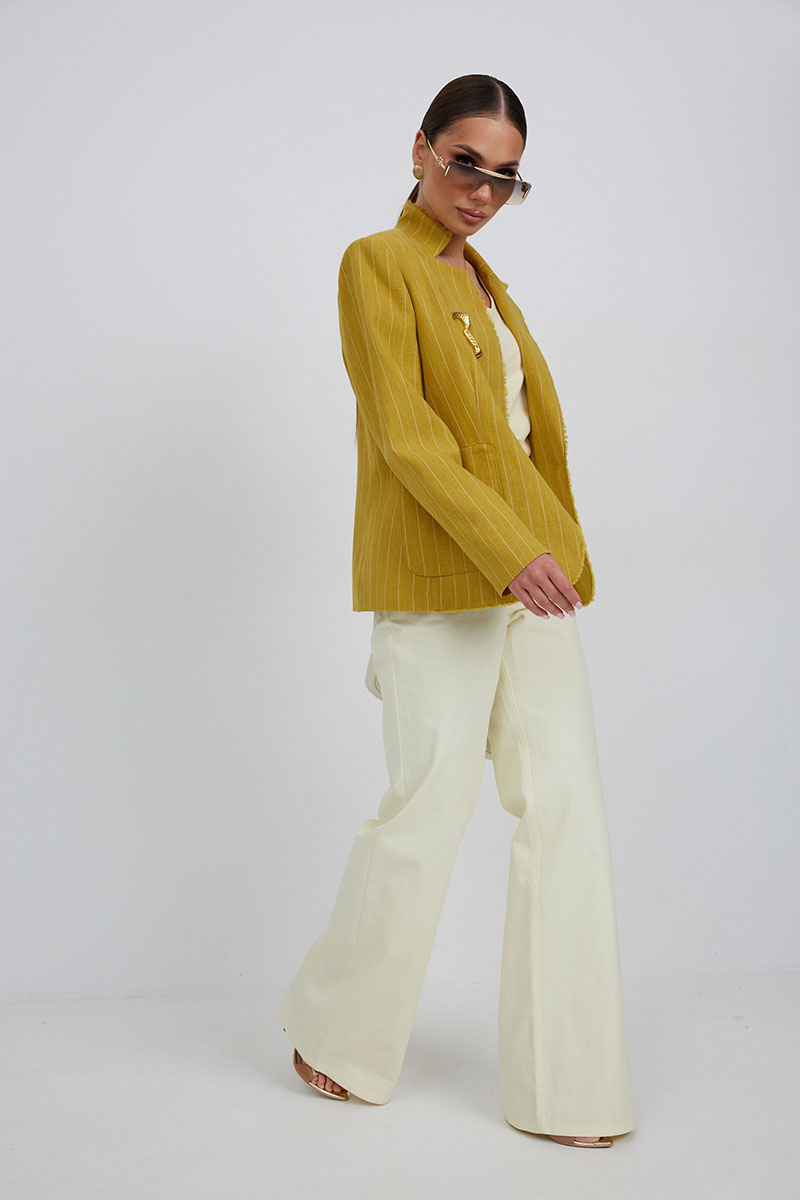 Жакет из льняной ткани в полоску, полуприлегающего силуэта, с центральной застежкой на одну петлю и декоративную пуговицу. Перед с нагрудной вытачкой и накладным карманом. Спинка с отрезным бочком, средним швом. Воротник ассиметричный. Слева - пиджачный, справа- стойка. По краю борта, низу переда, входу в карман и отлету воротника вставлена бахрома. Жакет на подкладке с плечевыми накладками.
