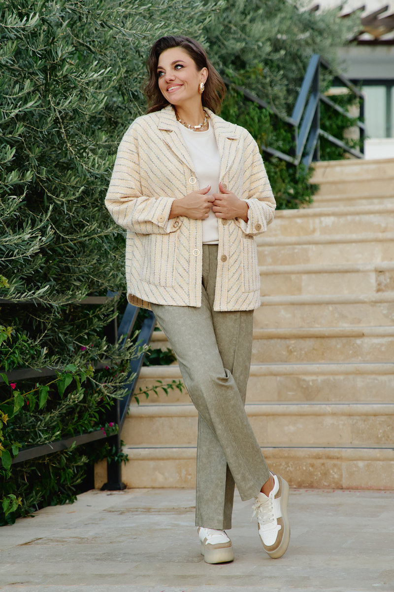 Женский жакет из трикотажного полотна в модном оттенке сливочного масла — это воплощение тепла и уюта, придающее любому образу нотку свежести и элегантности. Его мягкая текстура приятно ощущается на коже, создавая ощущение комфорта. В нем легко создать как повседневный, так и более нарядный образ. Жакет прямого силуэта однобортный на три стильные кнопки по борту. Воротник пиджачного типа с лацканами, по плечевому поясу втачная деталь "аля" погон. По переду жакета два накладных кармана. Жакет со спущенным плечом, втачной рукав внизу на манжете с застёжкой на кнопку-пуговицу. Спинка с отрезной кокеткой. Низ жакета закруглён к боковым швам.