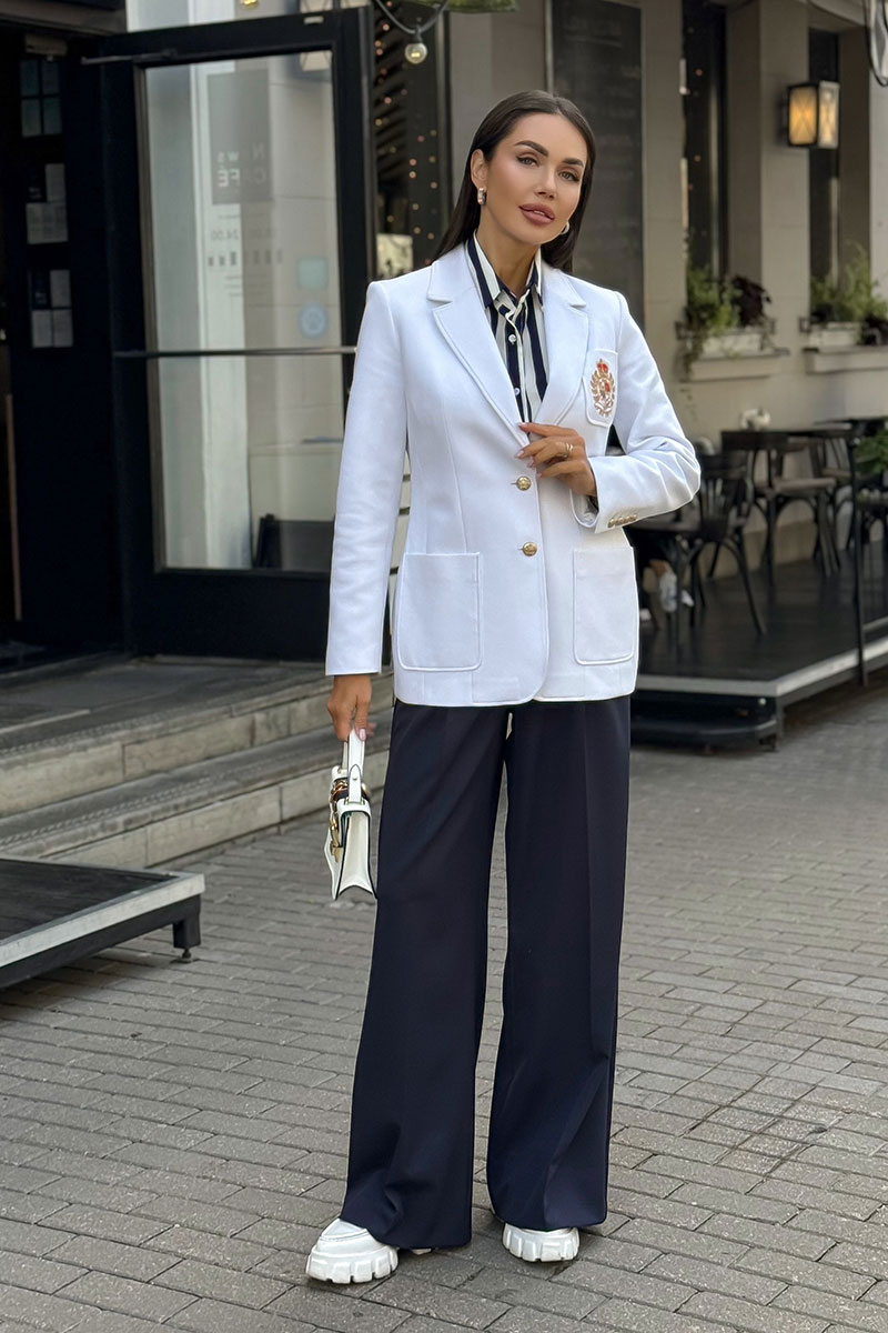 Жакет женский полуприлегающего силуэта с центральной бортовой застежкой на 2 петли и пуговицы, на подкладке. В нижней части переда настрочены 2 накладных карман, ширина шва настрачивания кармана - 0,5 см. На левой половинке переда настрочен нагрудный карман с эксклюзивной вышивкой, ширина шва настрачивания кармана - 0,5 см. Углы карман - скругленные. Спинка с рельефными швами, выходящими из проймы до низа и средним швом завершающийся шлицей. Горловина обработана отложным воротником пиджачного типа. По краю воротника, лацканам и борту проложена отделочная строчка на 0,5 см от края. Линия борта внизу закругленная. Рукава втачные двухшовные, длинные. В нижней части локтевого шва обработана отлетная закрытая шлица, застегивается на 4 петли и пуговицы. Плечевой пояс жакета оформлен плечевыми накладками.