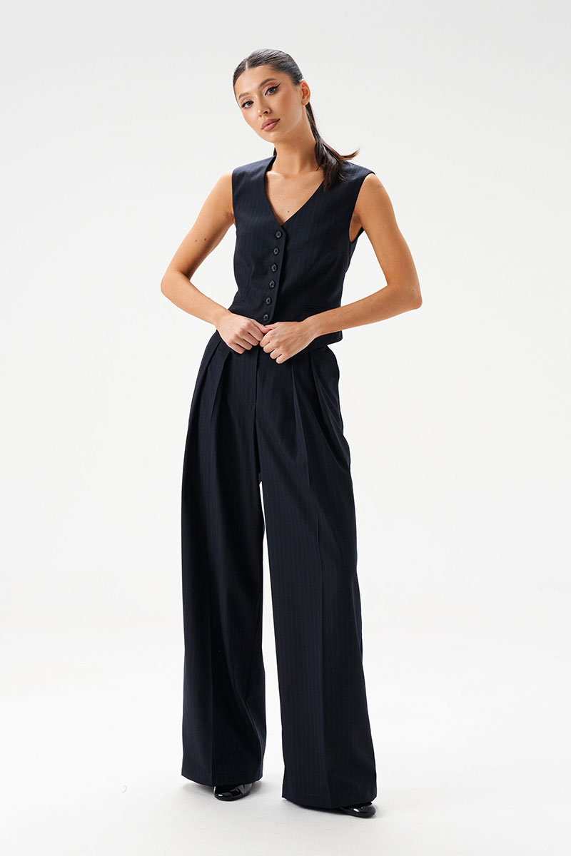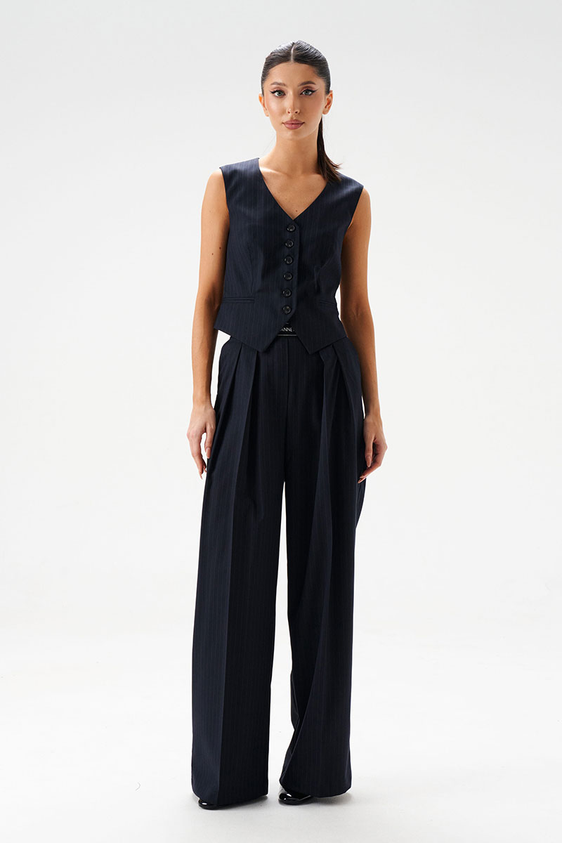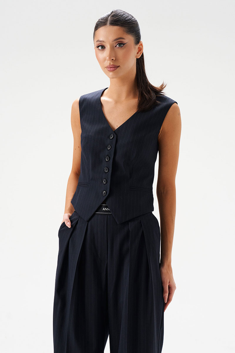 Жилет прямого свободного кроя выполнен из полотна тёмно-синего цвета в тонкую полоску. Характеристики однобортный, прямой крой, подкладка, прорезные карманы обманки, застежка центральная на петли - пуговицы, низ изделия по переду с фигурным низом.