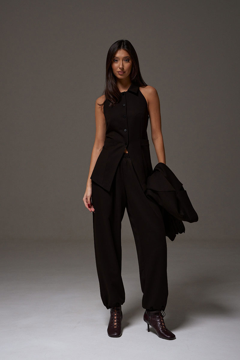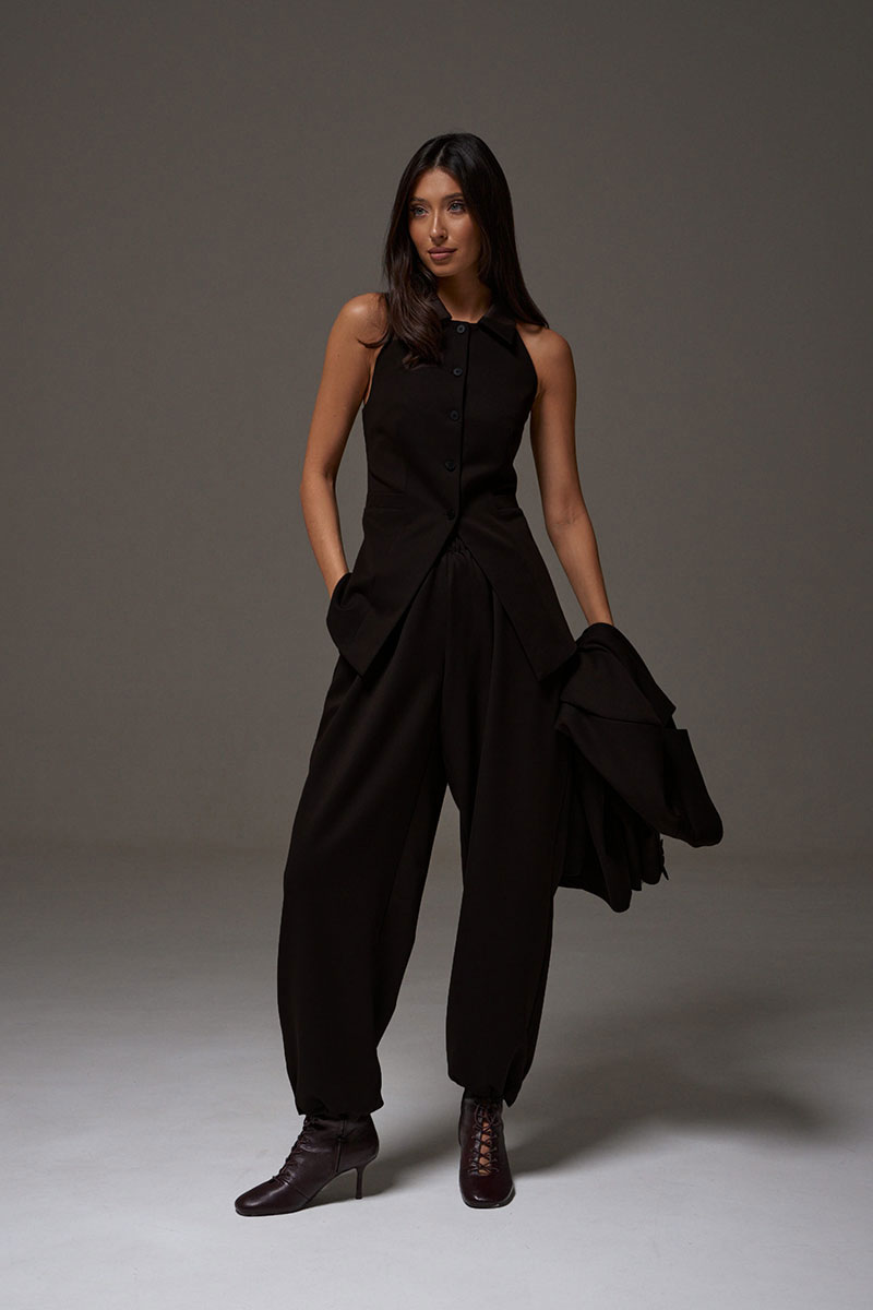 Жилет с открытыми плечами прилегающего силуэта выполнен из костюмной ткани черного цвета. Характеристики: прилегающий силуэт, подкладка, застежка центральная на петли пуговички, отложной воротник, по переду изделия карманы.