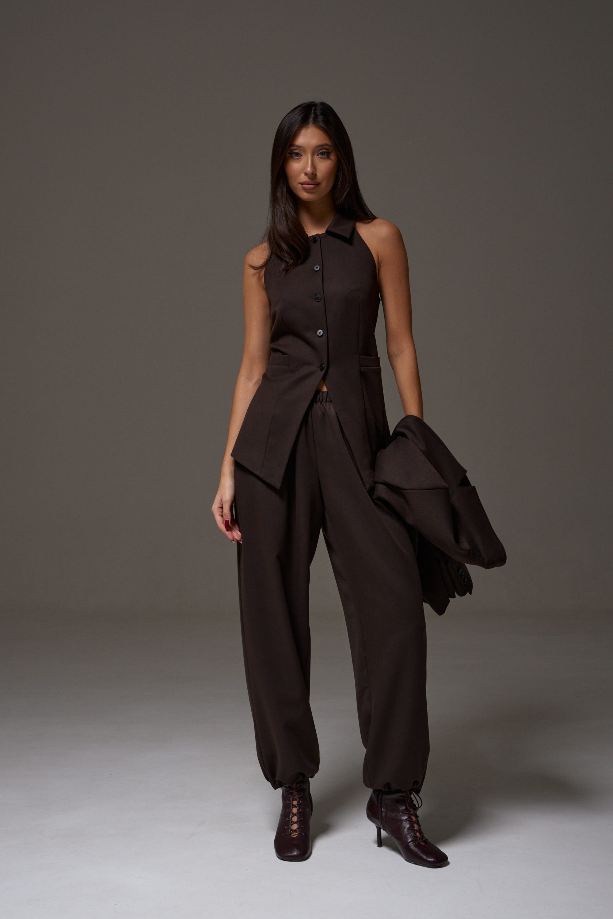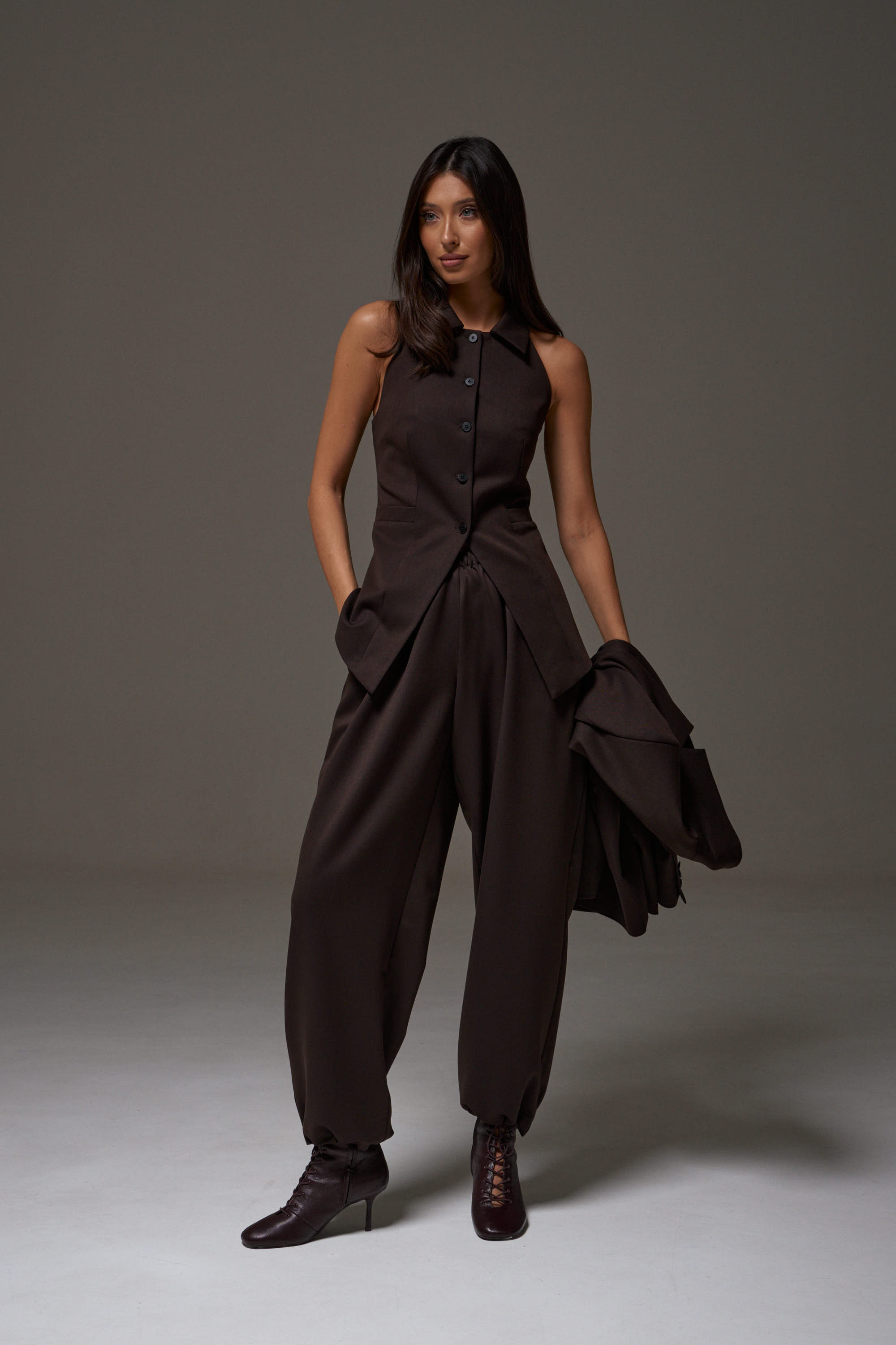 Жилет с открытыми плечами прилегающего силуэта выполнен из костюмной ткани шоколадного цвета. Характеристики: прилегающий силуэт, подкладка, застежка центральная на петли пуговички, отложной воротник, по переду изделия карманы.