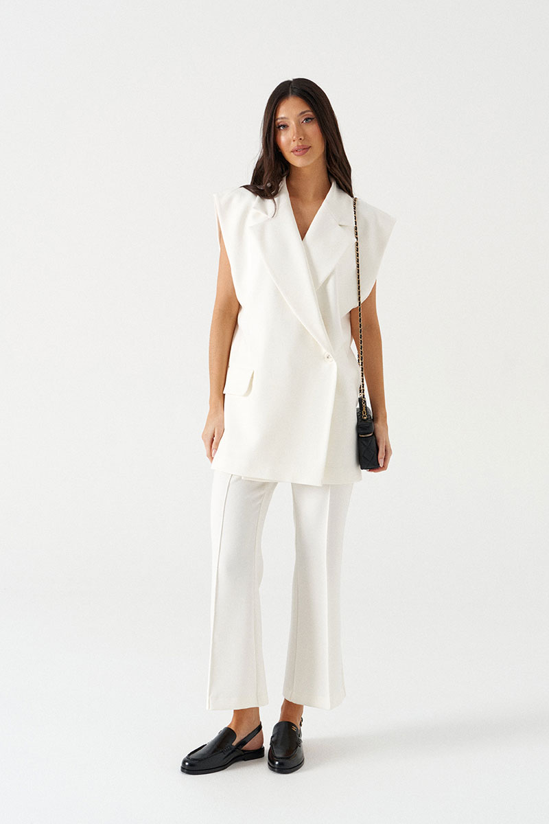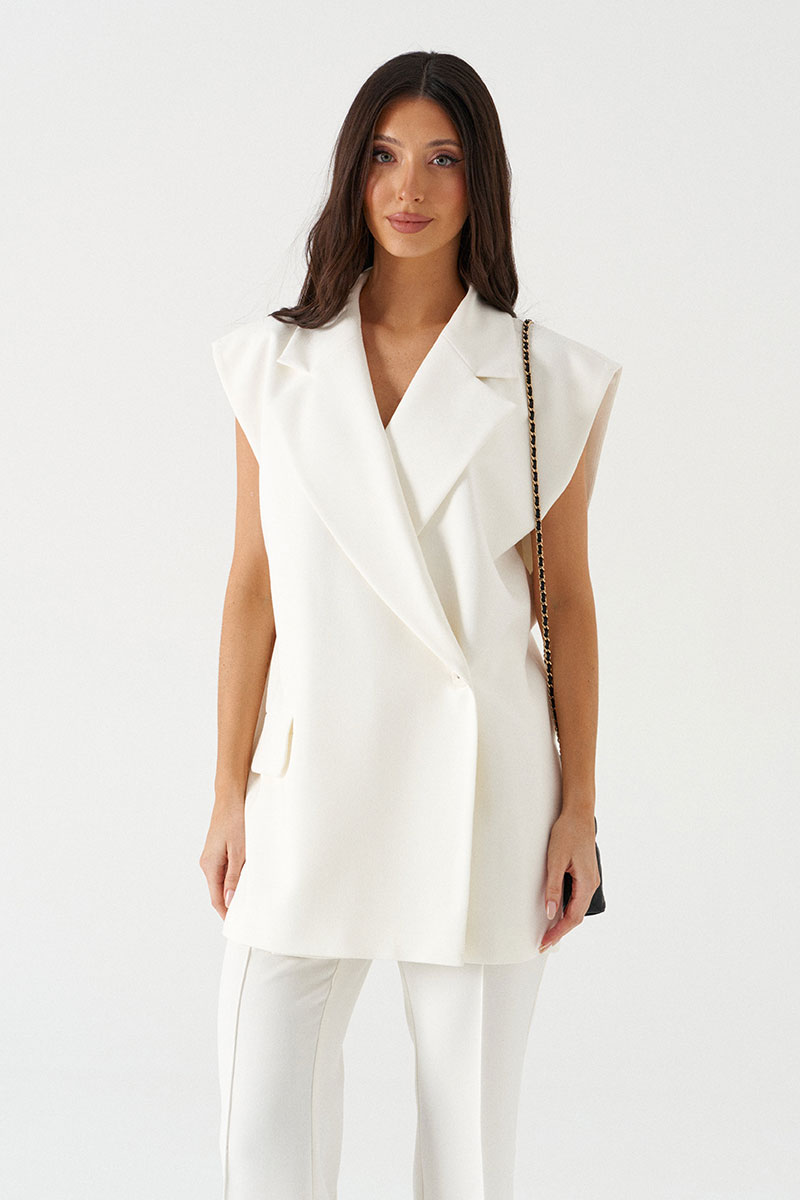Жилет однобортный, выполнен из костюмной ткани белого цвета. Характеристика: прямой крой, подклад, воротник отложной с широким лацканом, линия плеча спущенная, застёжка смещённая - на одну пуговицу, карман с клапаном (функциональный).
