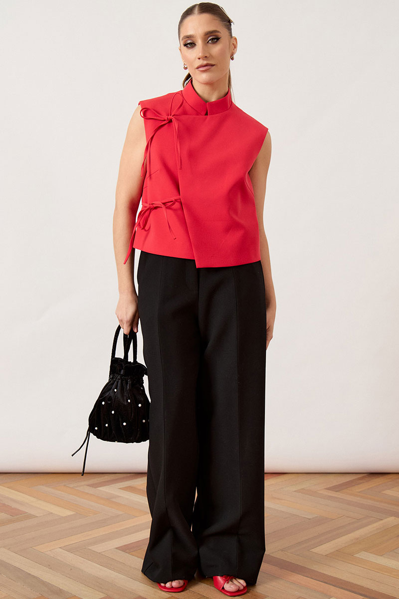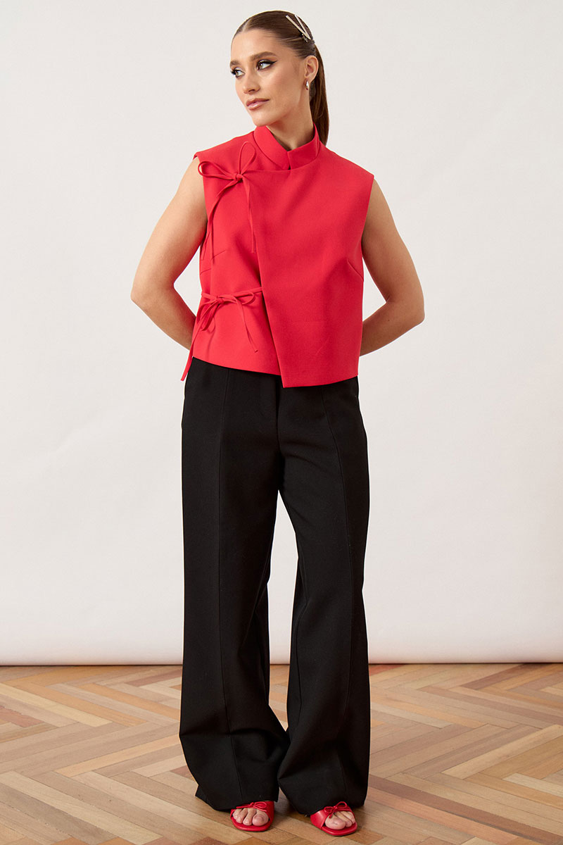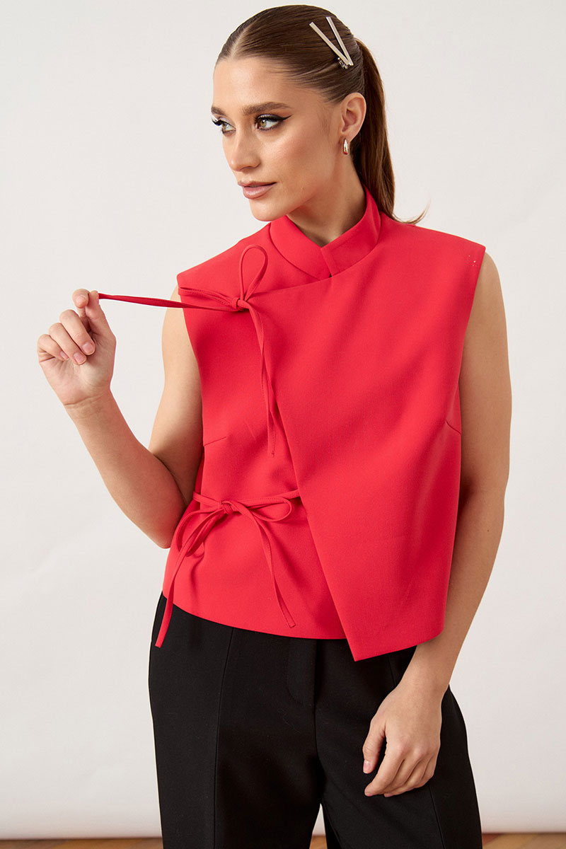 Жилет женский, прямого силуэта, выполнен из плотной костюмной ткани. Модель с воротником-стойкой и глубоким асимметричным запахом на правую сторону. Главной декоративной особенностью изделия являются две пары функциональных завязок из основной ткани, расположенных по правому борту, которые фиксируются на мягкие банты. Перед и спинка с талиевыми вытачками для обеспечения легкого прилегания. Линия плеча укорочена, пройма обработана обтачкой вчистую. Спинка со средним швом. Изделие на подкладке.