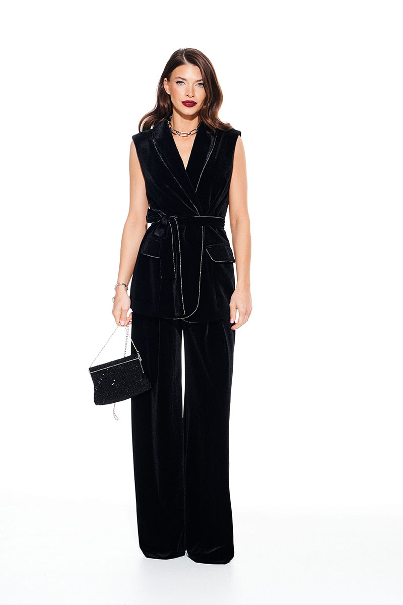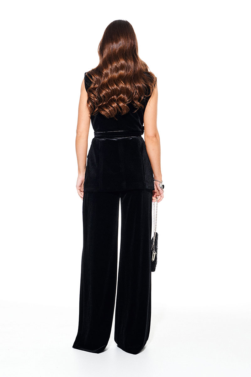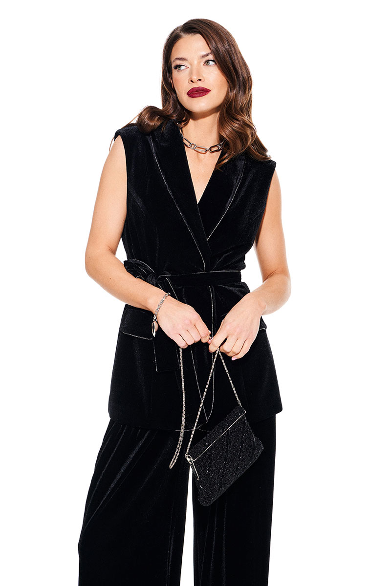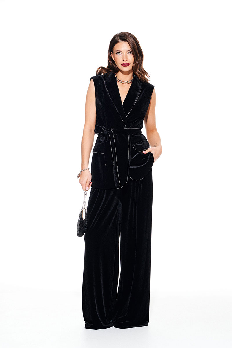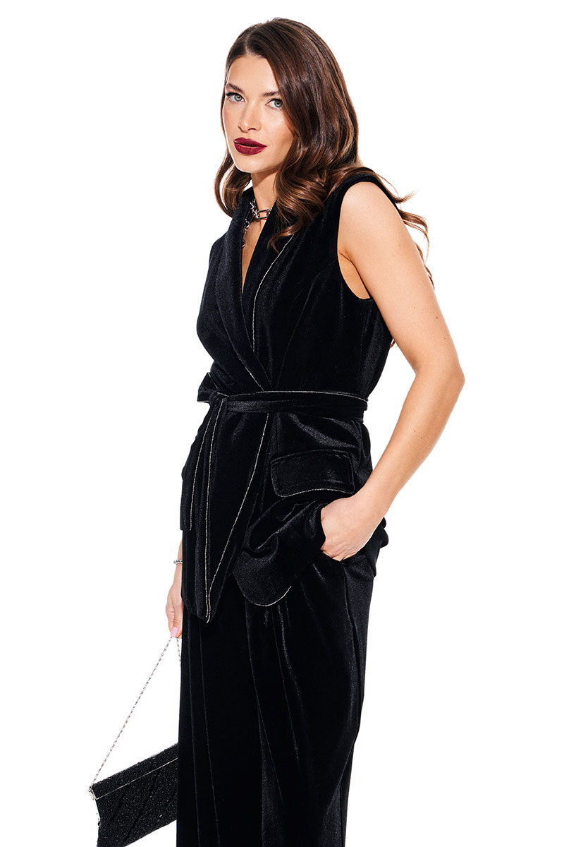 Жилет из бархата на трикотажной основе, прямого силуэта, однобортный, с отложным воротником, на подкладке. Детали переда с рельефами и прорезными карманами с клапаном и двумя обтачками. Спинка со средним швом и рельефами. Воротник, клапаны, подборта и пояс – оформлены декоративной тесьмой.