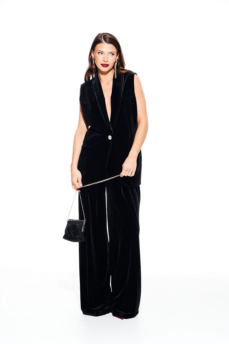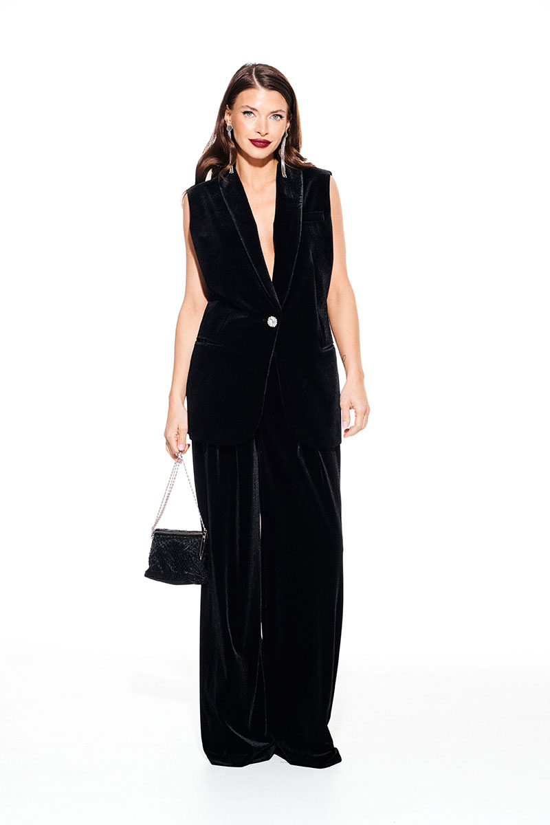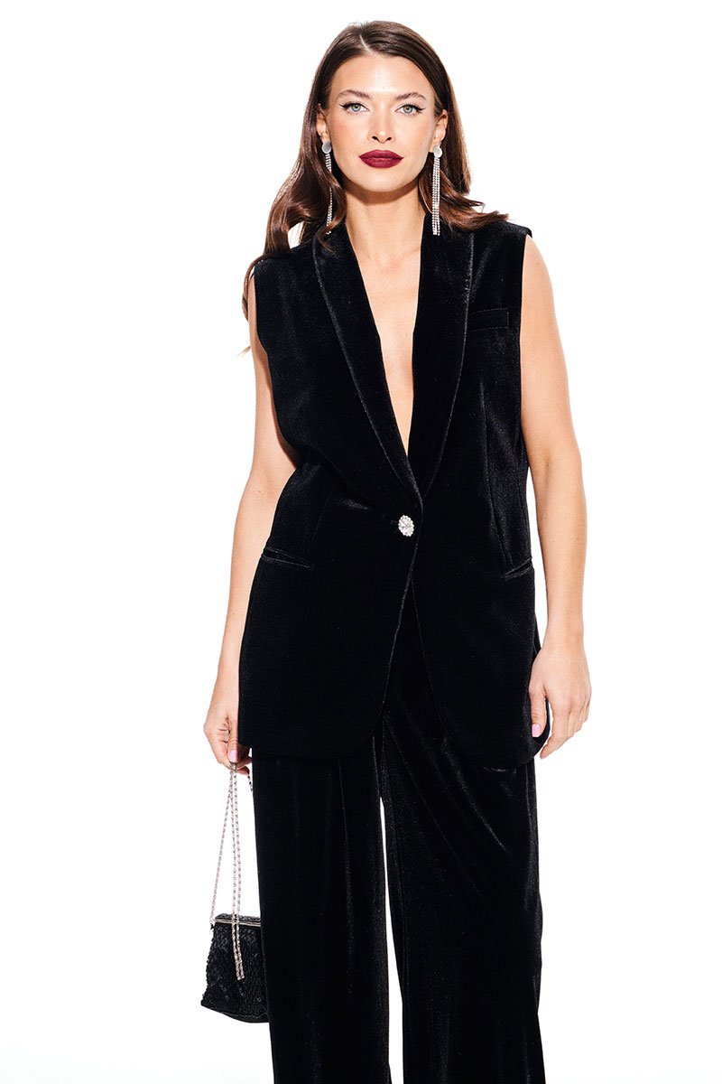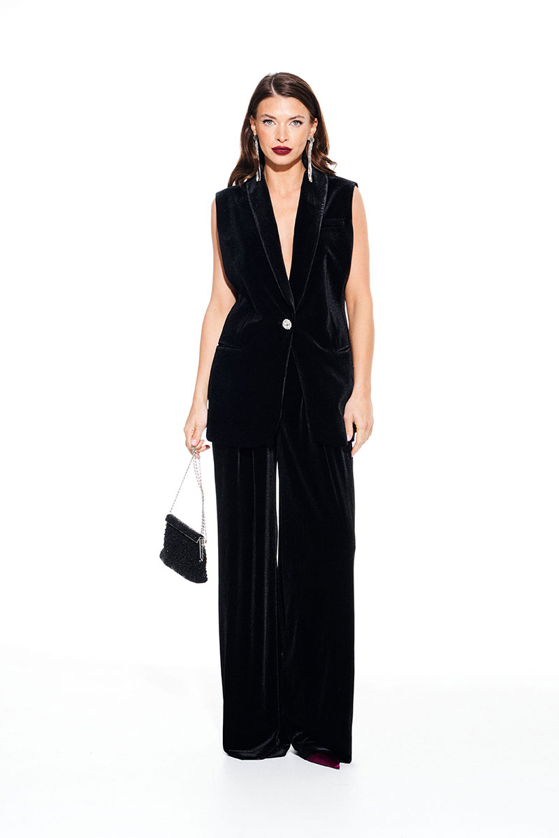 Жилет из бархата на трикотажной основе, прямого силуэта, однобортный, с центральной застежкой на 1 петлю и 1 пуговицу, на подкладке. Детали переда с талиевыми вытачками, отрезными бочками и прорезными карманами в рамку. На левой полочке нагрудный карман с листочкой. Спинка со средним швом и талиевыми вытачками. Воротник – шалевый с фигурным краем.