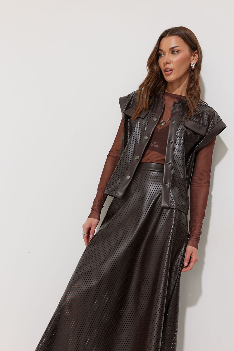 Жилет прямого силуэта из экокожи с перфорацией. Горловина-стойка, по переду застежка на кнопки. Жилет со спущенной линией плеча и отделочными манжетами. По переду кокетка с декоративными клапанами и шлевками для ремня. В комплект входит съемный ремень. Обращаем ваше внимание, что фурнитура может отличаться от фото.