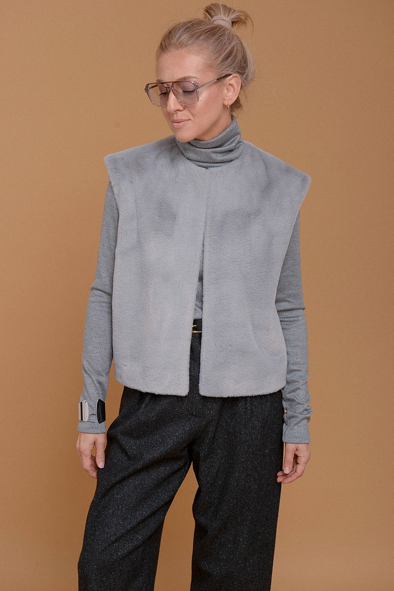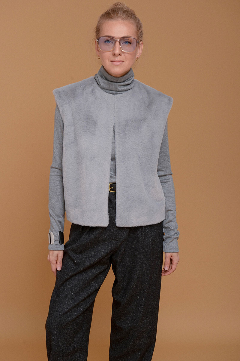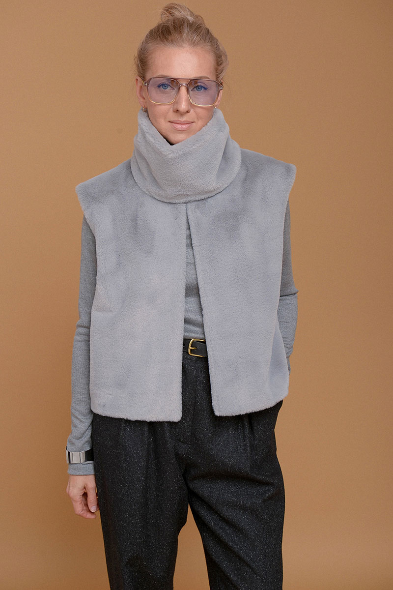 Жилет из итальянского экомеха с высоким воротником. Уютный и унверсальный. Настолько нежный, что с ним не захочется расставаться. Высокий воротник можно носить отдельно от жилета в качестве стильной замены шарфа. Жилет дополнен приятной к коже подкладочной тканью из твила. Без застежки. Используйте жилет как дополнительный согревающий слой под пальто или куртку.