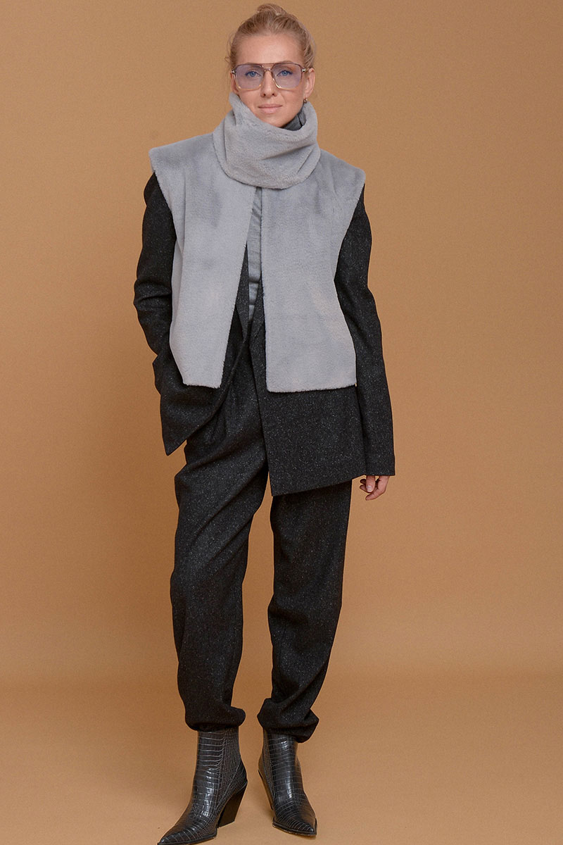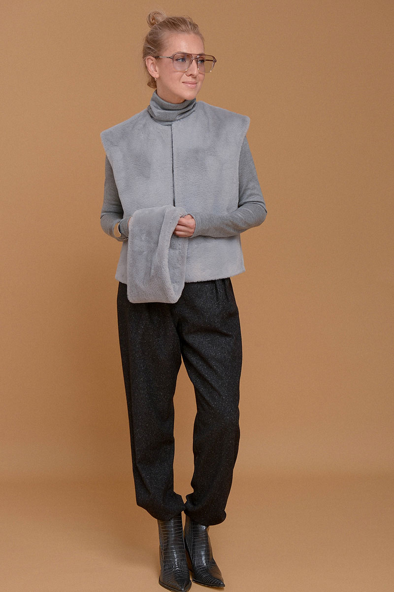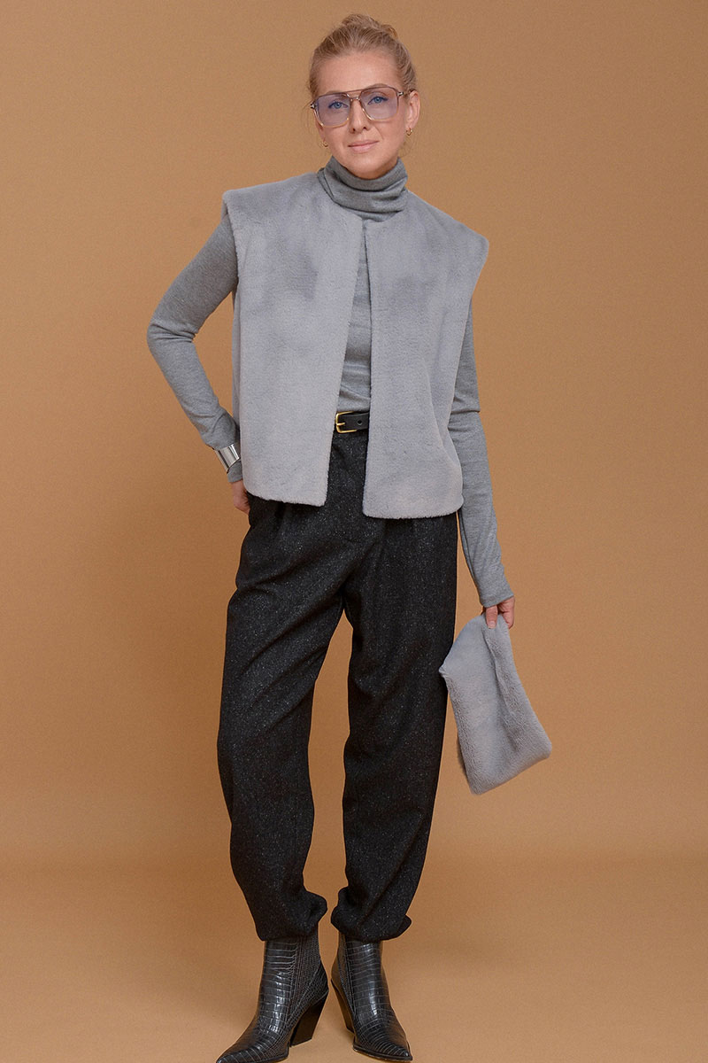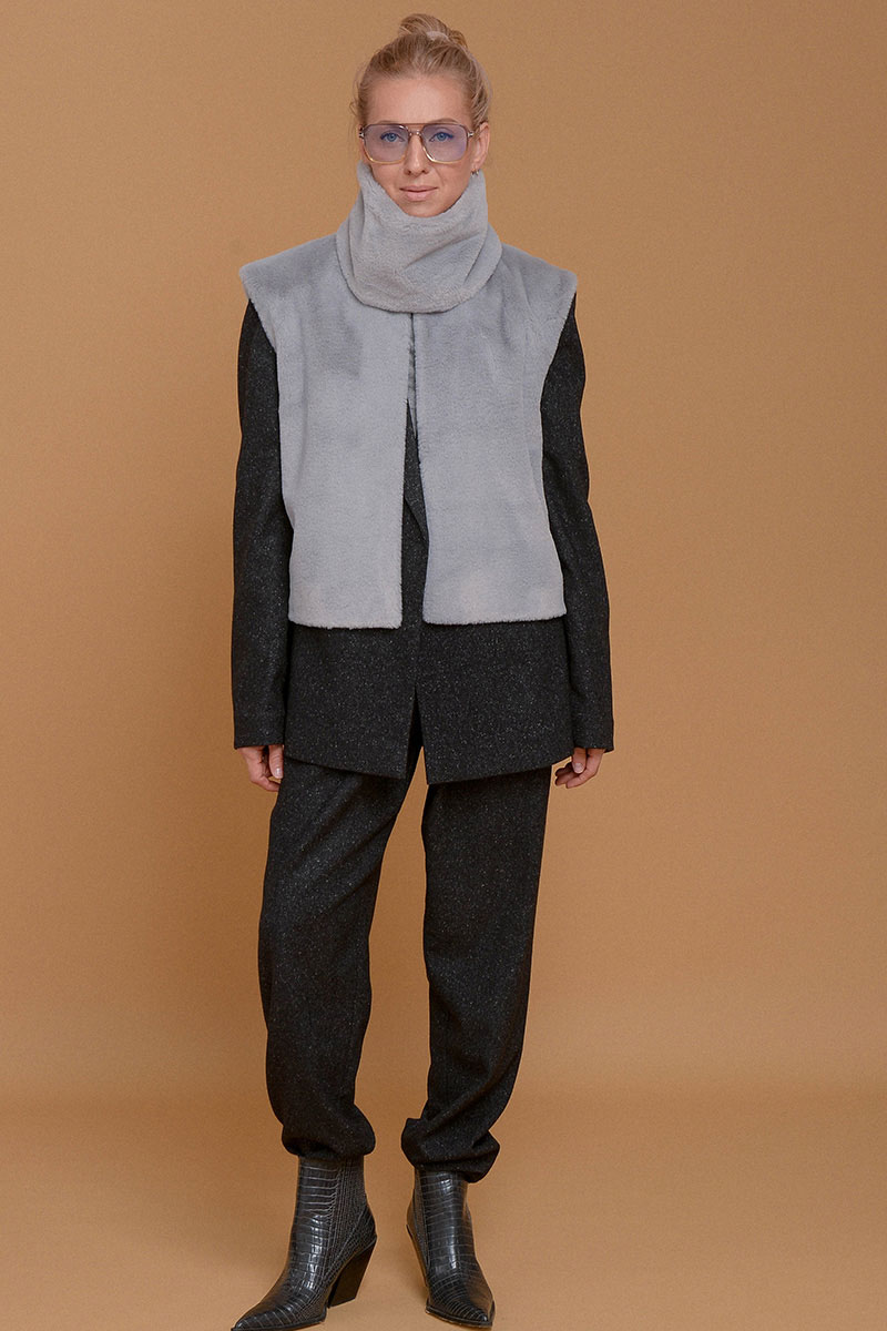 Жилет из итальянского экомеха с высоким воротником. Уютный и унверсальный. Настолько нежный, что с ним не захочется расставаться. Высокий воротник можно носить отдельно от жилета в качестве стильной замены шарфа. Жилет дополнен приятной к коже подкладочной тканью из твила. Без застежки. Используйте жилет как дополнительный согревающий слой под пальто или куртку.