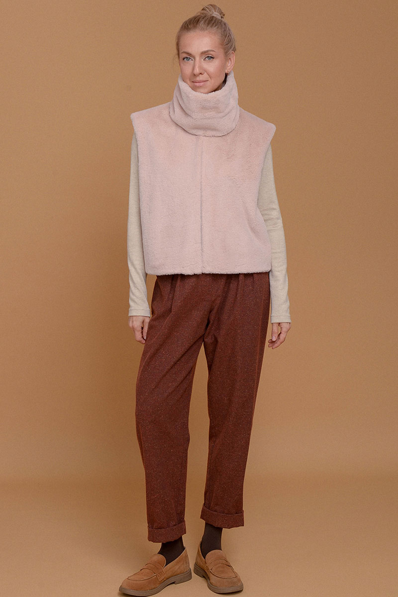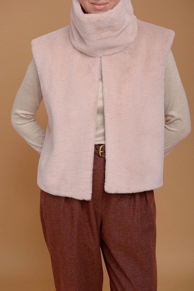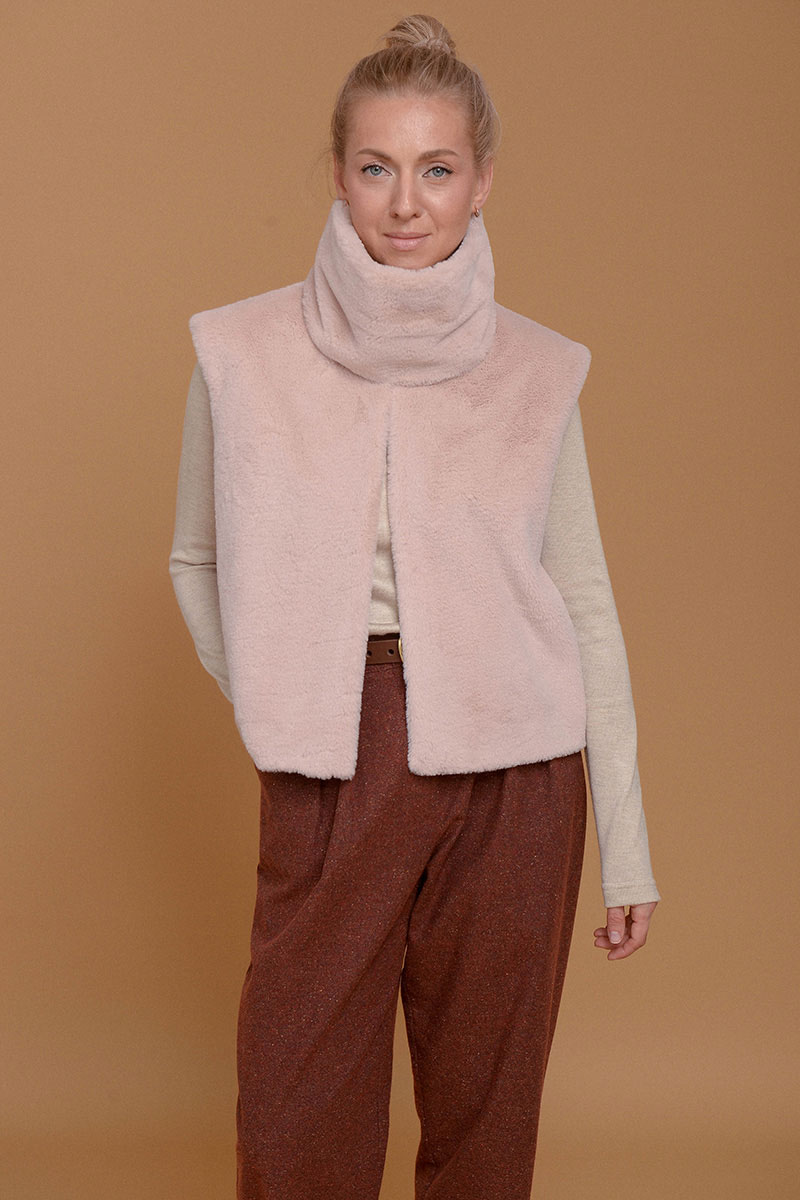 Жилет из итальянского экомеха с высоким воротником в пудровом оттенке. Добавит свежести и уюта к любому образу. Настолько нежный, что с ним не захочется расставаться. Высокий воротник можно носить отдельно от жилета, в качестве стильной замены шарфа. Жилет дополнен приятной к коже подкладочной тканью из твила. Без застежки. Используйте жилет как дополнительный согревающий слой под пальто или куртку.