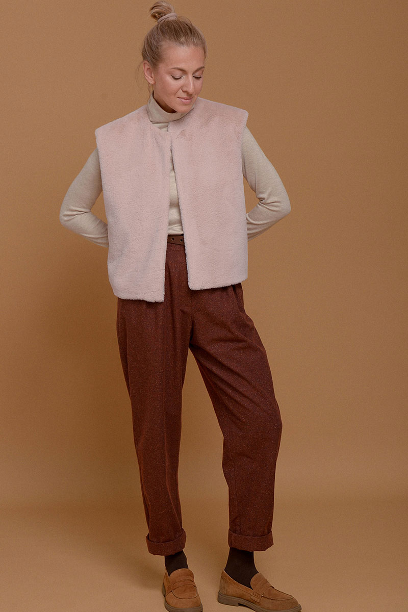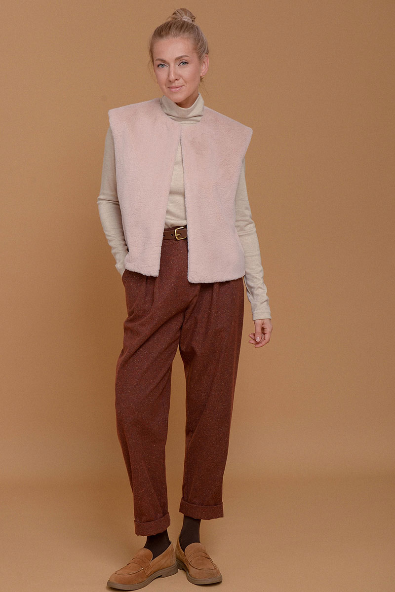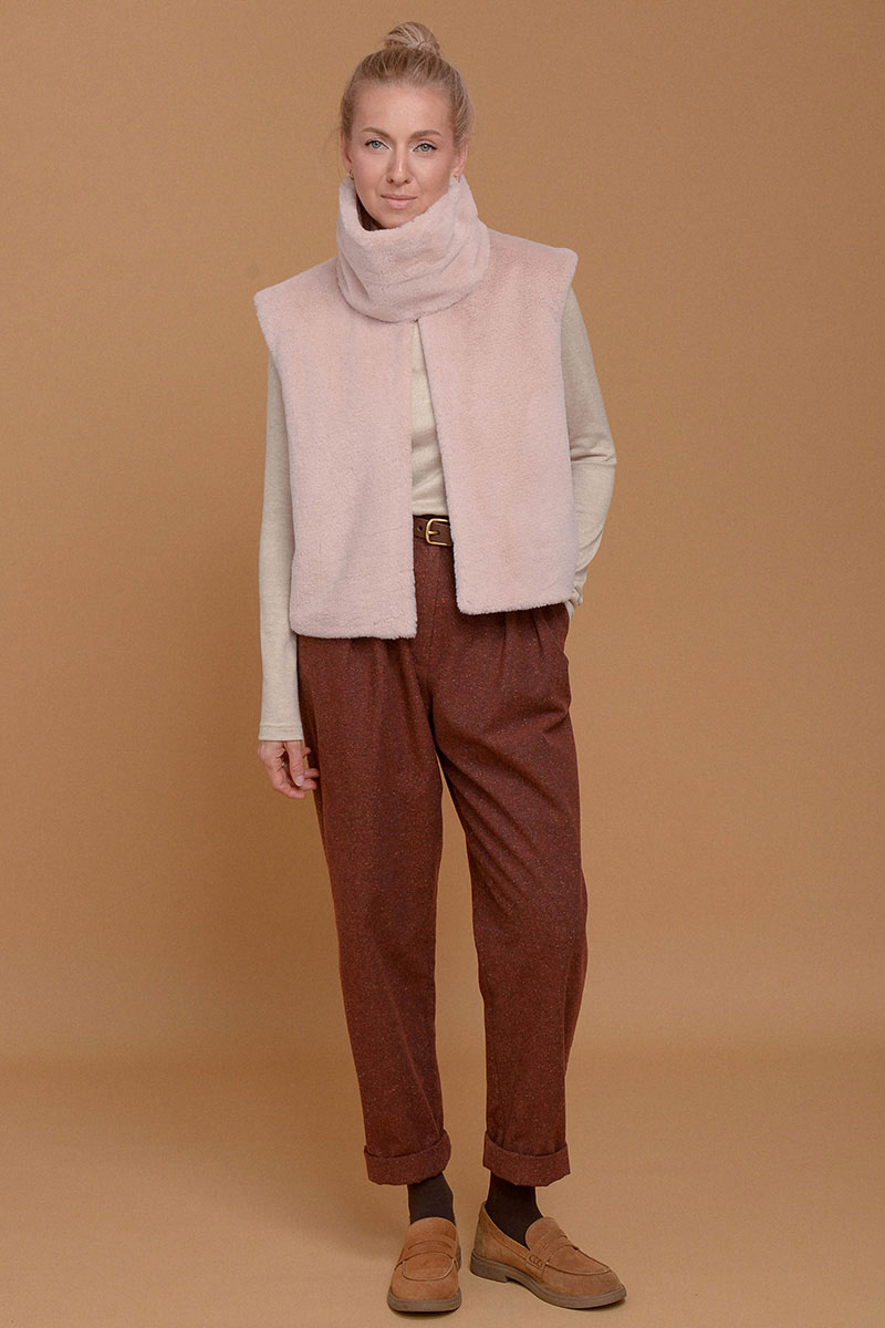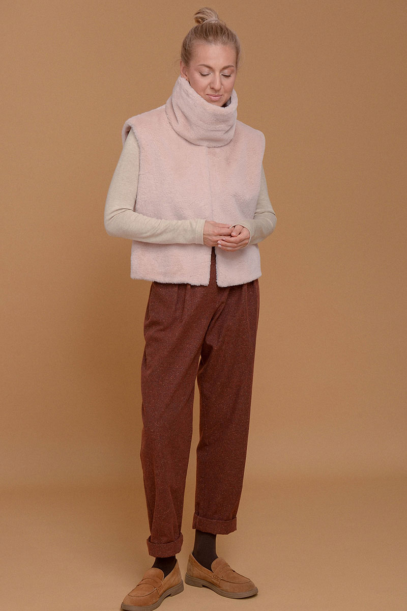 Жилет из итальянского экомеха с высоким воротником в пудровом оттенке. Добавит свежести и уюта к любому образу. Настолько нежный, что с ним не захочется расставаться. Высокий воротник можно носить отдельно от жилета, в качестве стильной замены шарфа. Жилет дополнен приятной к коже подкладочной тканью из твила. Без застежки. Используйте жилет как дополнительный согревающий слой под пальто или куртку.