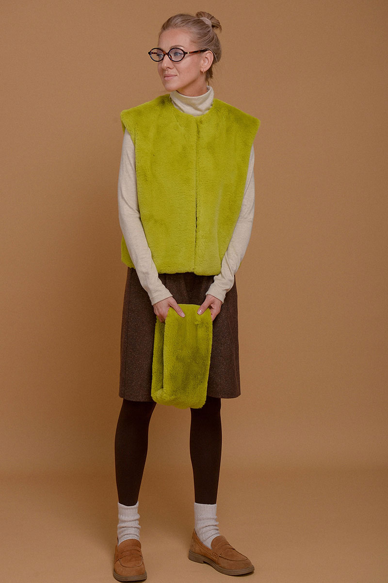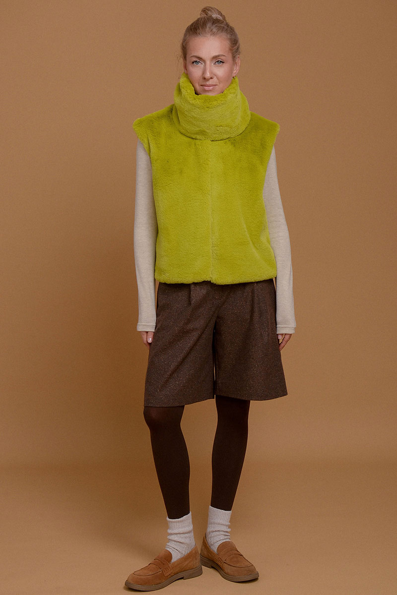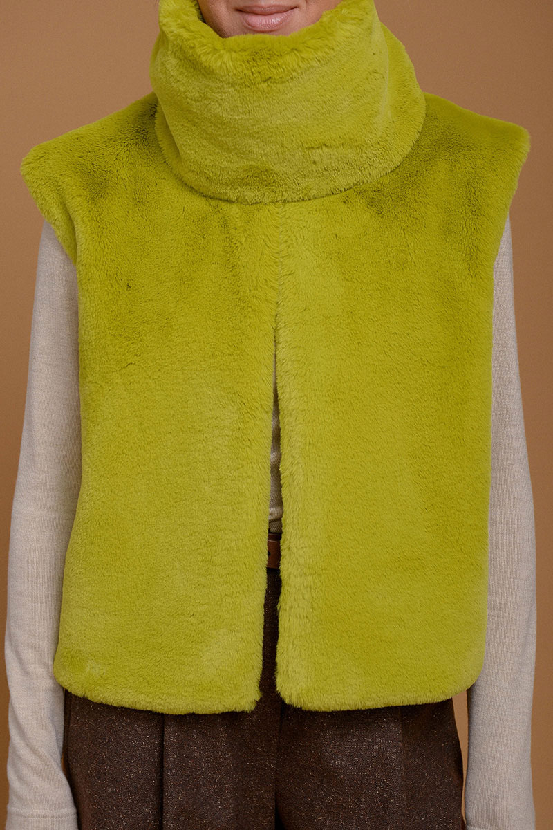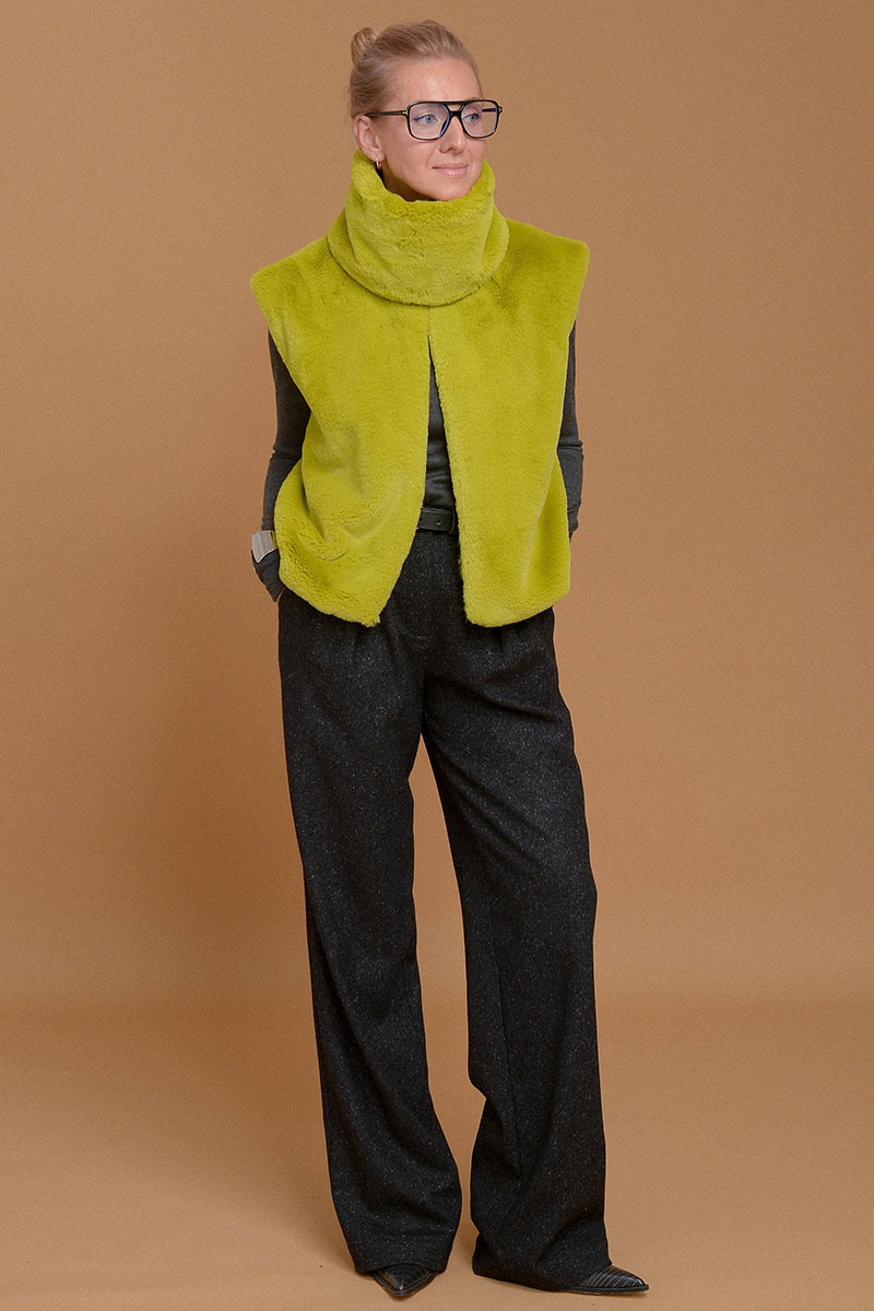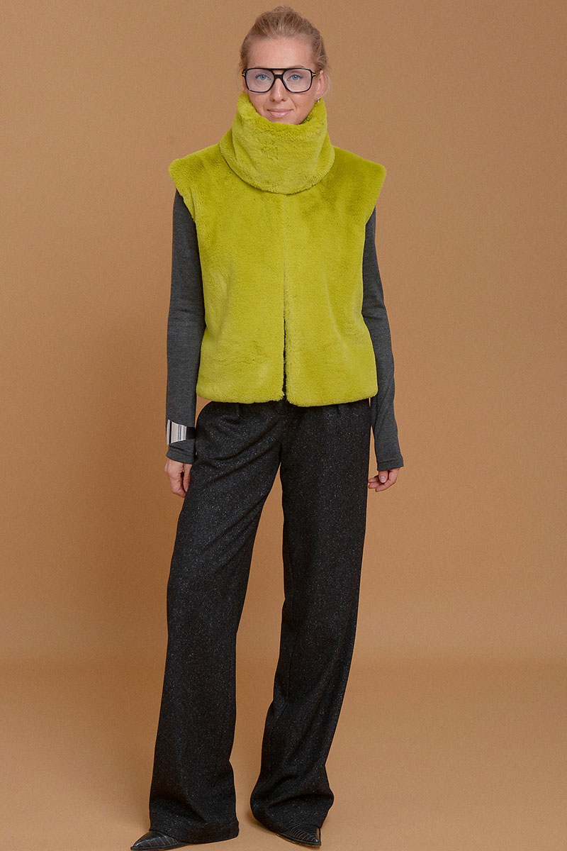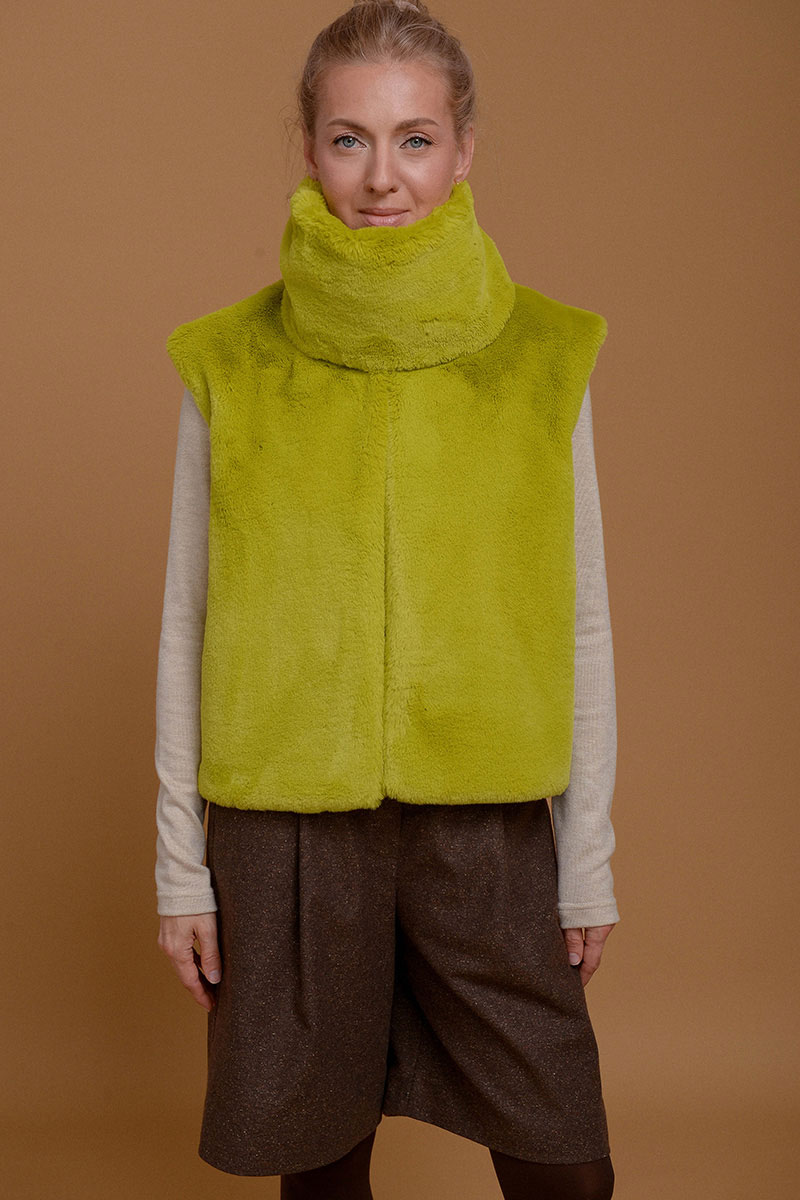 Жилет из итальянского экомеха с высоким воротником в невероятно красивом зеленом оттенке шартрез. Добавит свежести и уюта к любому образу. Настолько нежный, что с ним не захочется расставаться. Высокий воротник можно носить отдельно от жилета в качестве стильной замены шарфа. Жилет дополнен приятной к коже подкладочной тканью из твила. Без застежки. Используйте жилет как дополнительный согревающий слой под пальто или куртку.