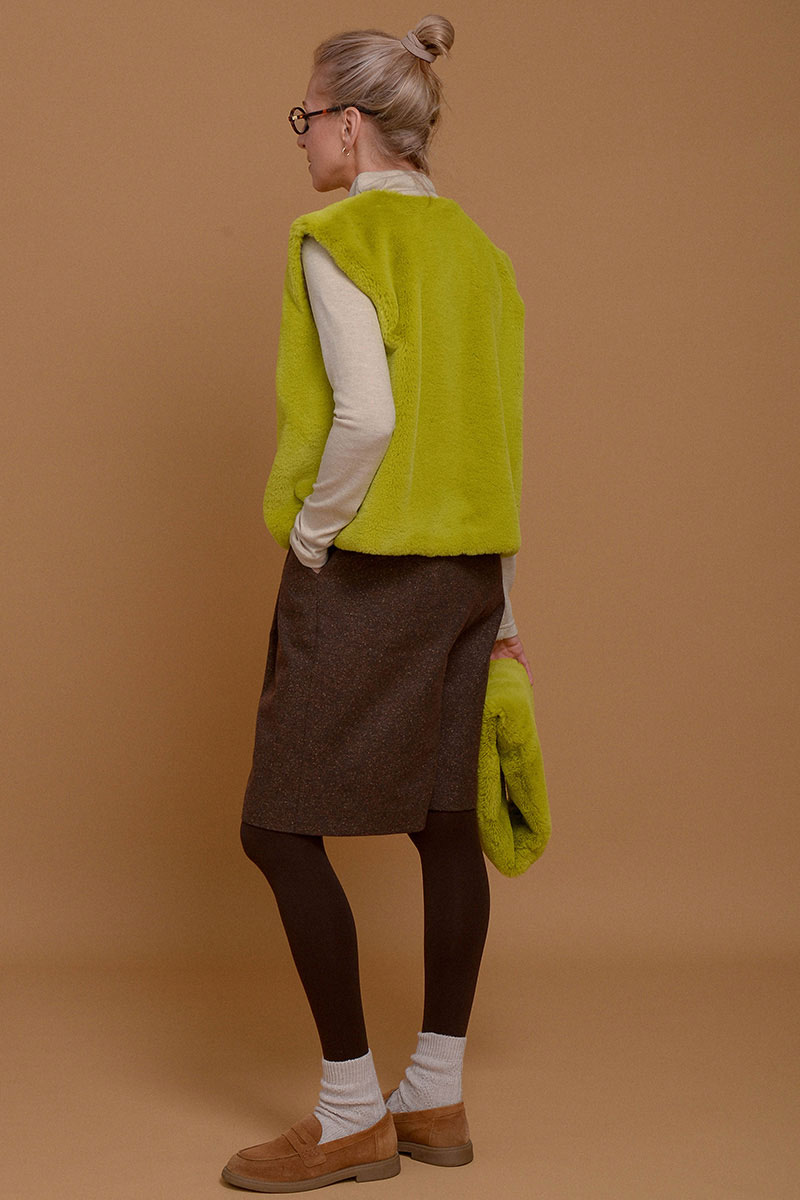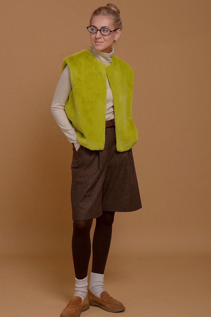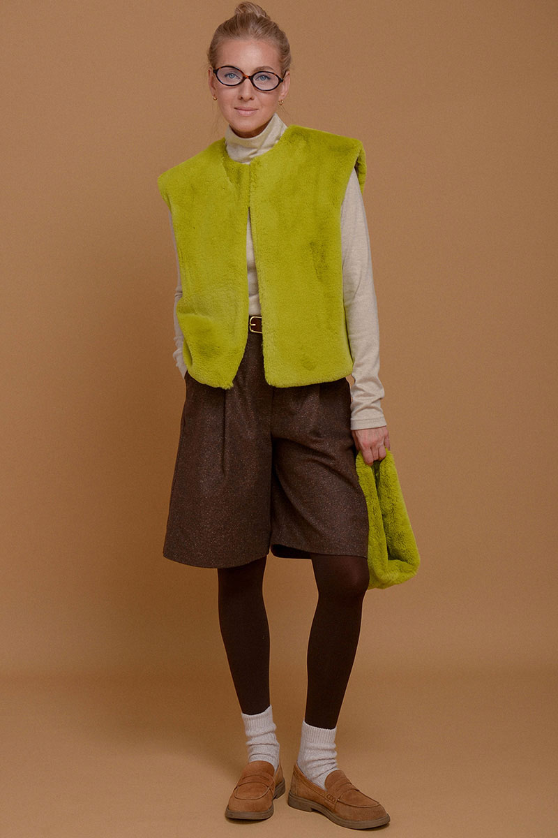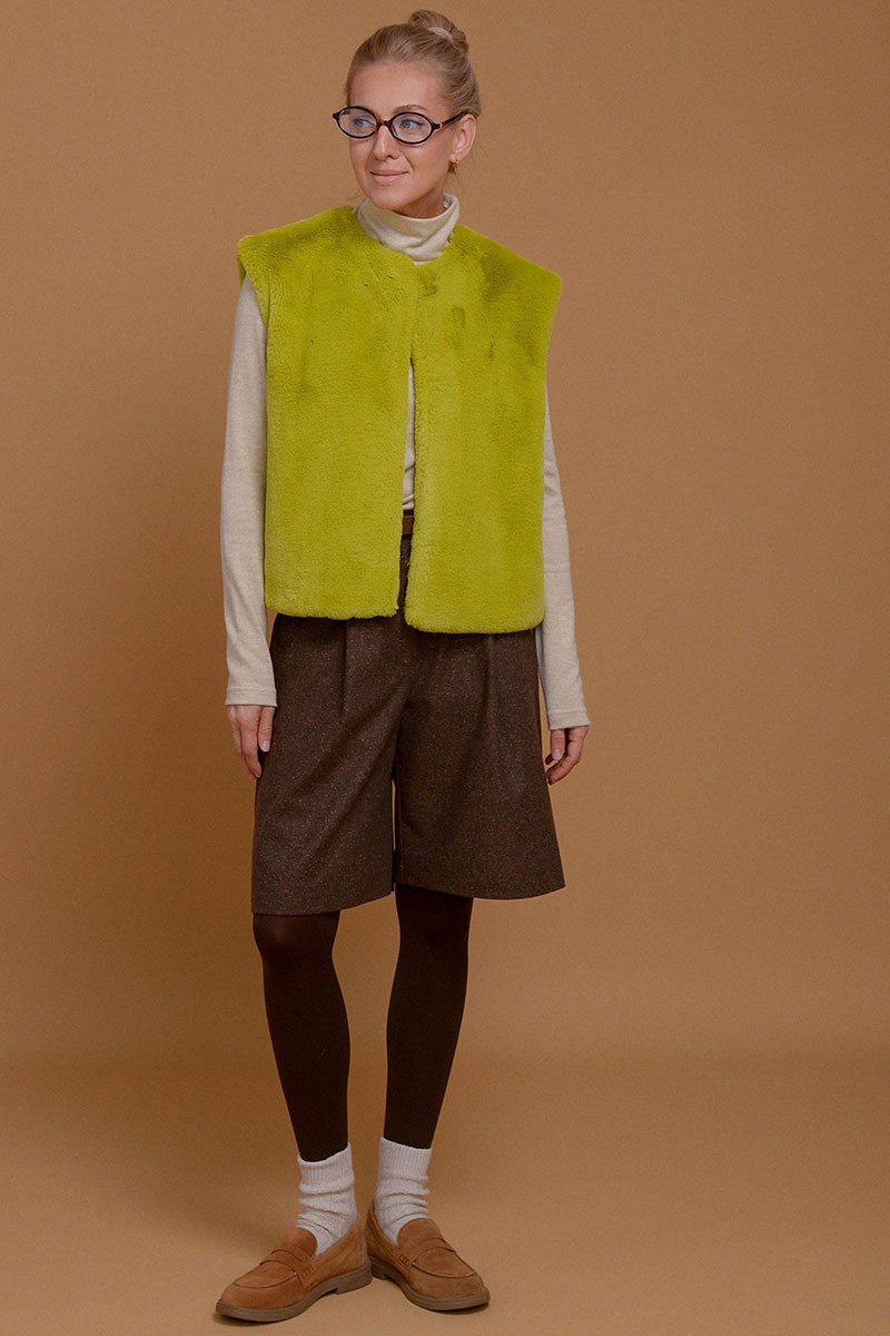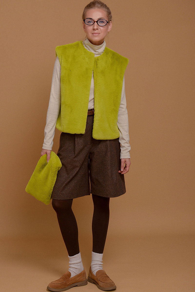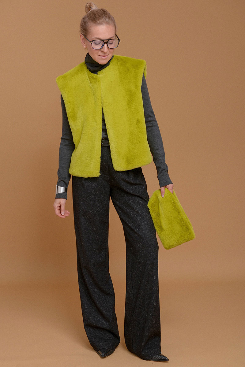 Жилет из итальянского экомеха с высоким воротником в невероятно красивом зеленом оттенке шартрез. Добавит свежести и уюта к любому образу. Настолько нежный, что с ним не захочется расставаться. Высокий воротник можно носить отдельно от жилета в качестве стильной замены шарфа. Жилет дополнен приятной к коже подкладочной тканью из твила. Без застежки. Используйте жилет как дополнительный согревающий слой под пальто или куртку.