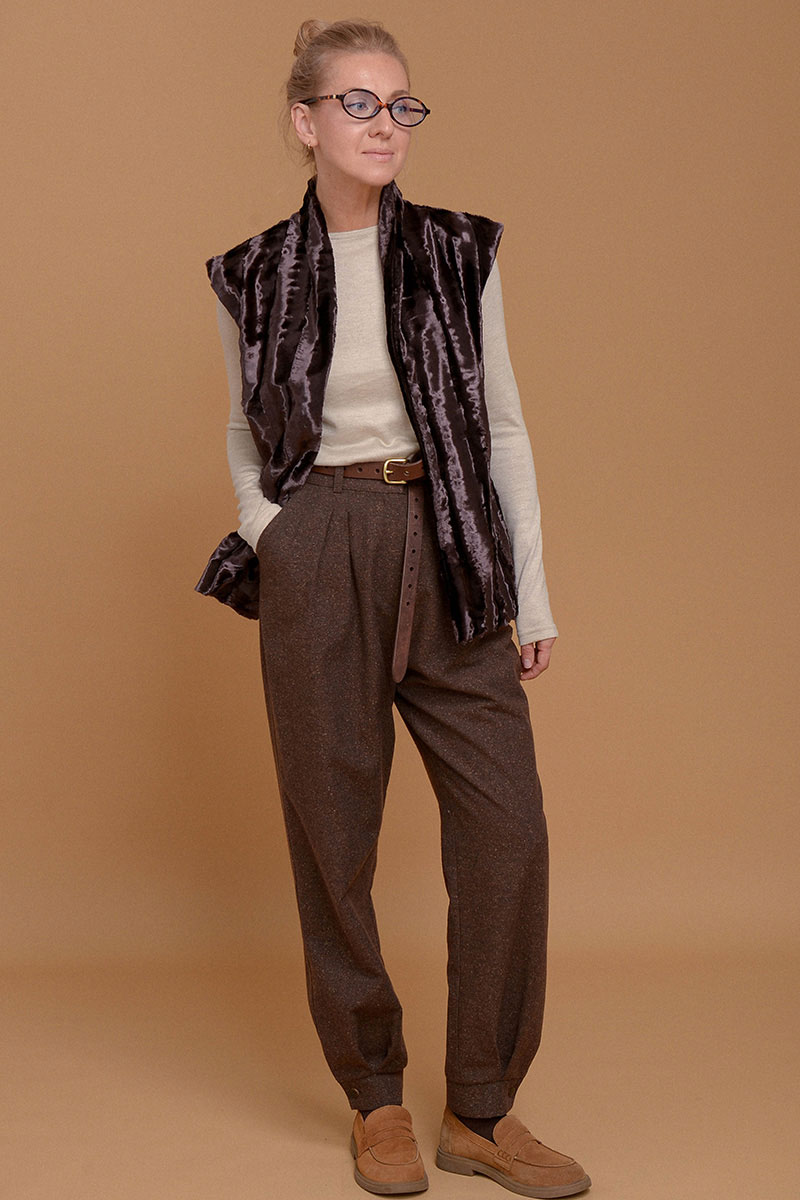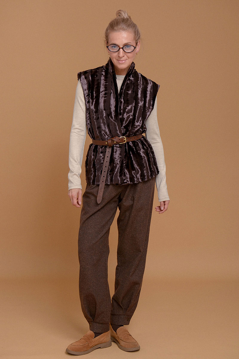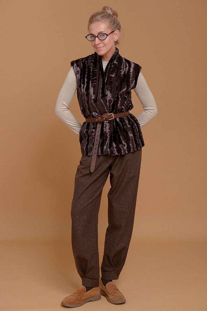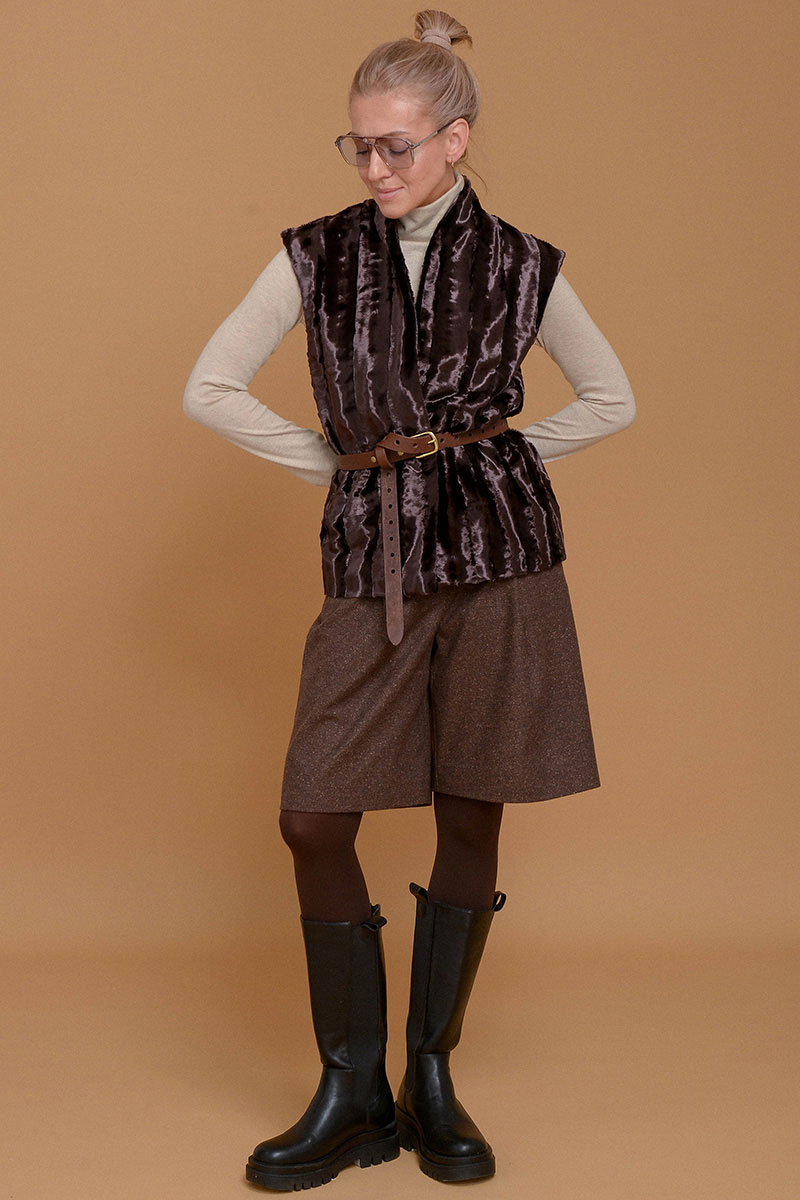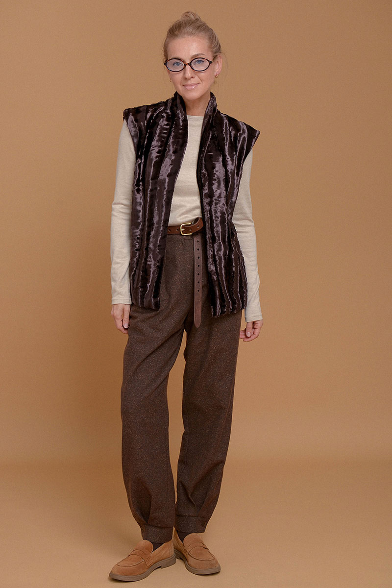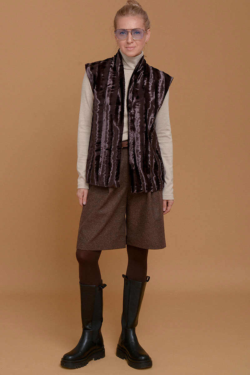 Жилет из премиального итальянского экомеха на основе хлопка. Согреет и сделает любой образ шикарным. Дополнен приятной к коже подкладочной тканью из твила. Без застежки. Можно сочетать с кожаным ремнем в цвет или оставить свободный силуэт. Используйте жилет как дополнительный согревающий слой под пальто или куртку.