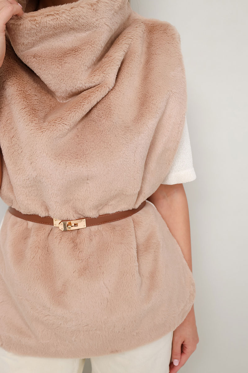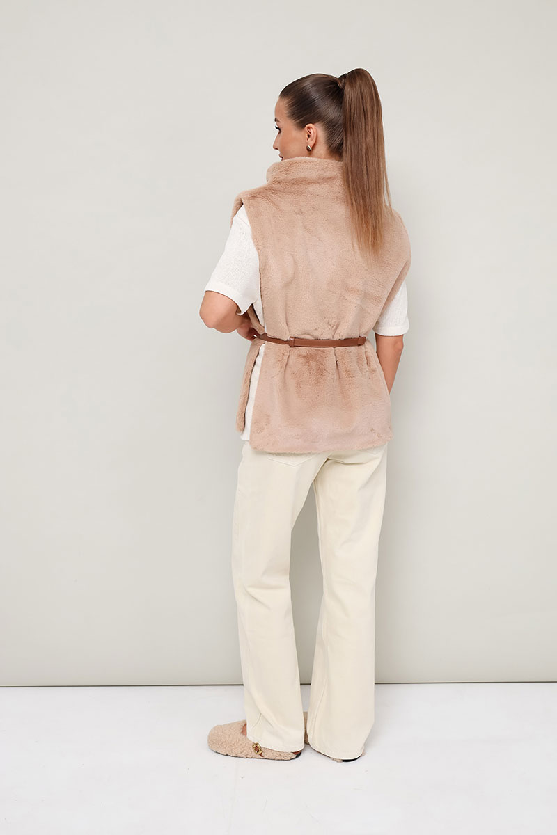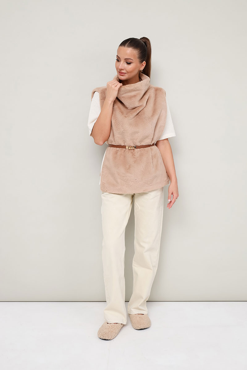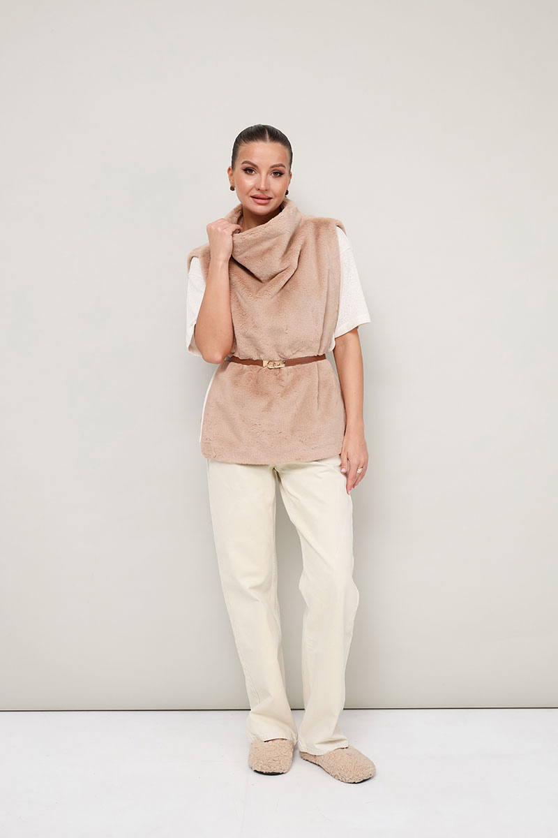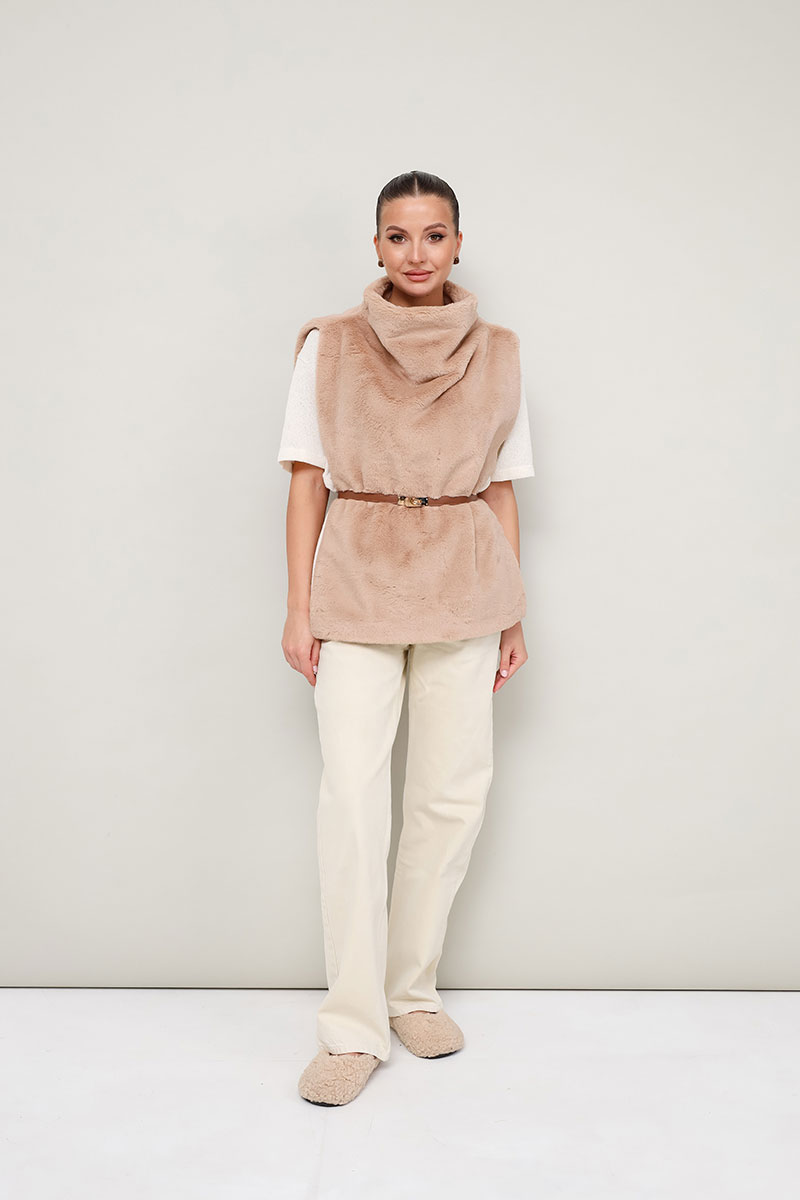 Стильный жилет прямого силуэта, выполнен из искусственного меха на подкладке. Цельнокроеный воротник-стойка. Идеальный выбор для холодных дней, который сочетает в себе комфорт, тепло и актуальный дизайн.