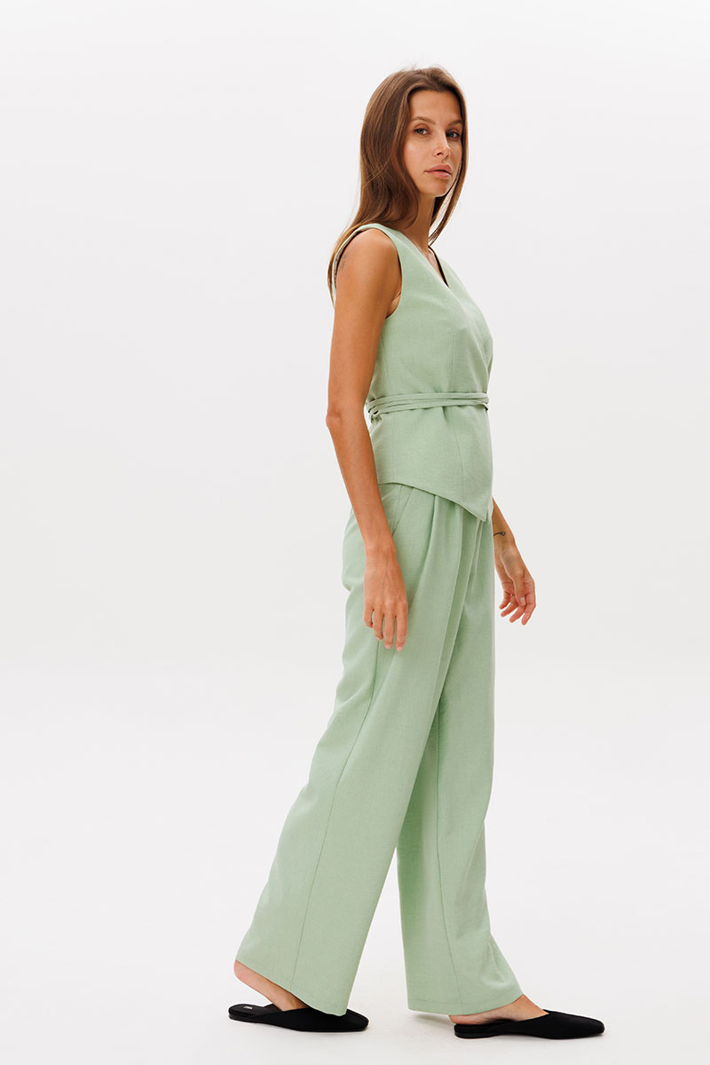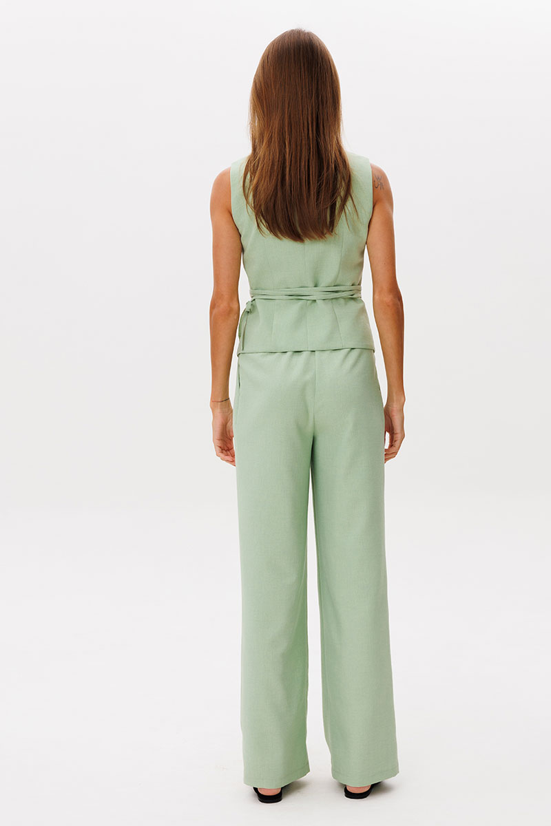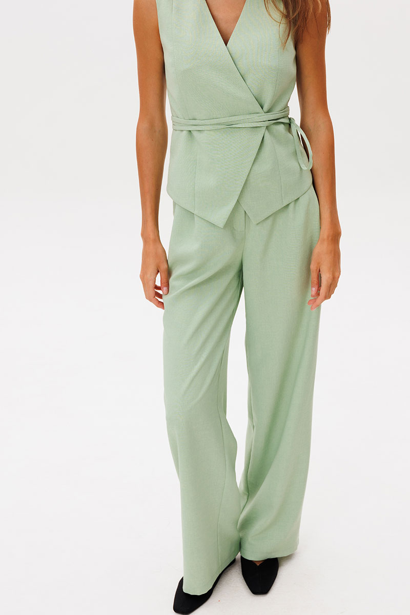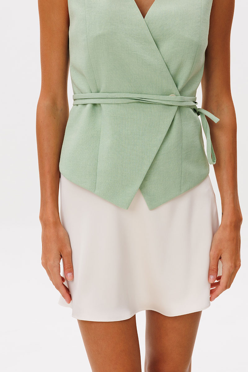 Жилетка на запах,вырез V-образный, прилегающего силуэта, по переду рельефы, спинка разрезная по центру с талиевыми выточками, застежка на петлю-пуговицу в комплекте со съемным поясом-шнурком. Жилет на подкладке.