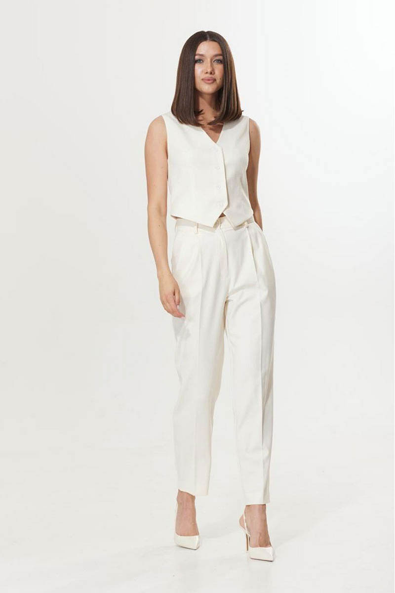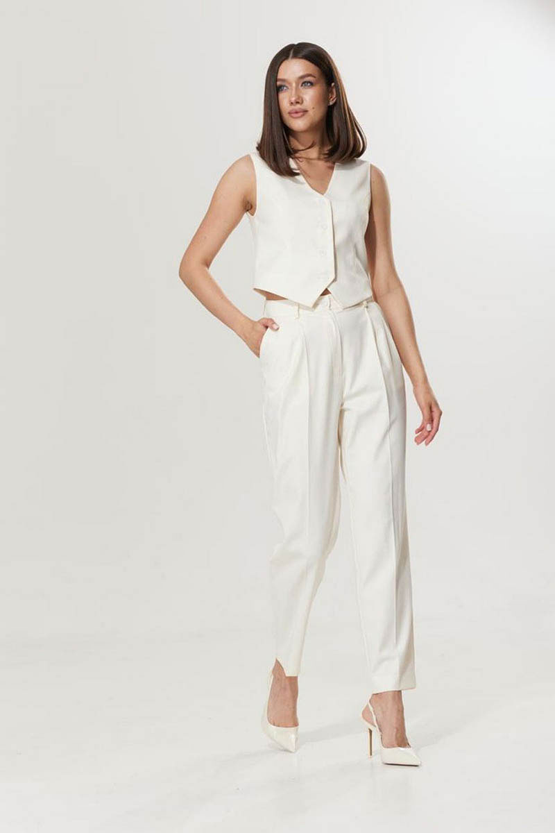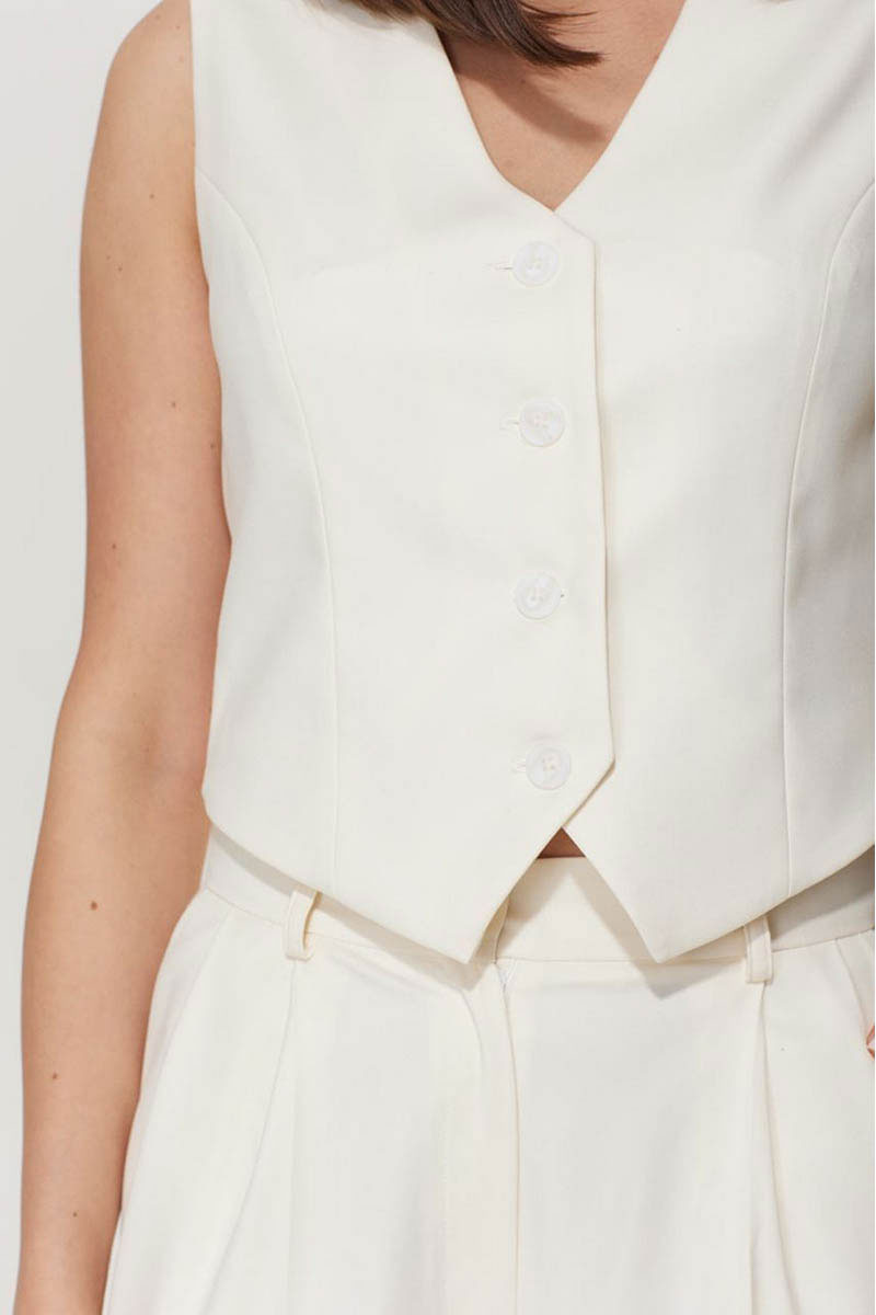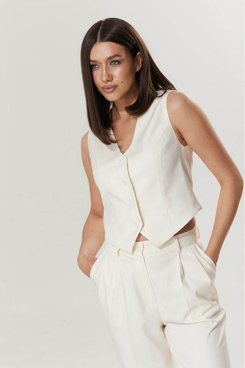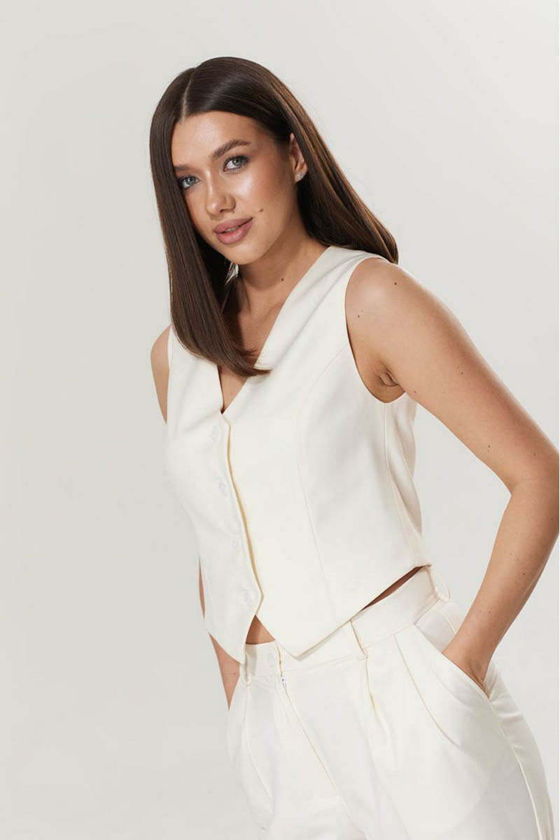 Женский жилет полуприлегающего силуэта из качественной костюмной ткани — это образец сдержанной элегантности и продуманного дизайна.