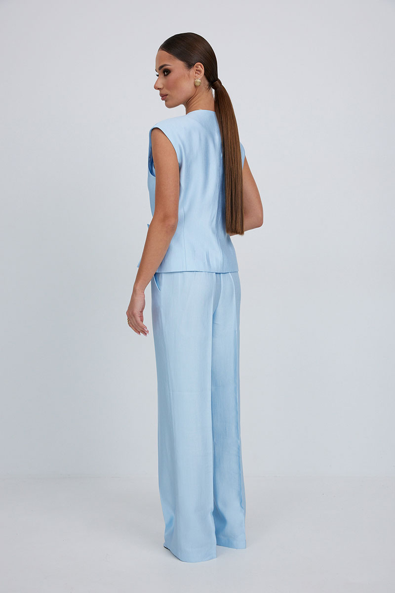 Жилет из костюмно-плательной ткани полуприлегающего силуэта, со смещенной застежкой на пряжку. Перед правый с отрезным бочком и накладным клапаном, по горловине лацкан округлой формы. Левый перед с подрезом и складками по низу. Спинка с отрезным бочком и средним швом. Жилет на подкладке.