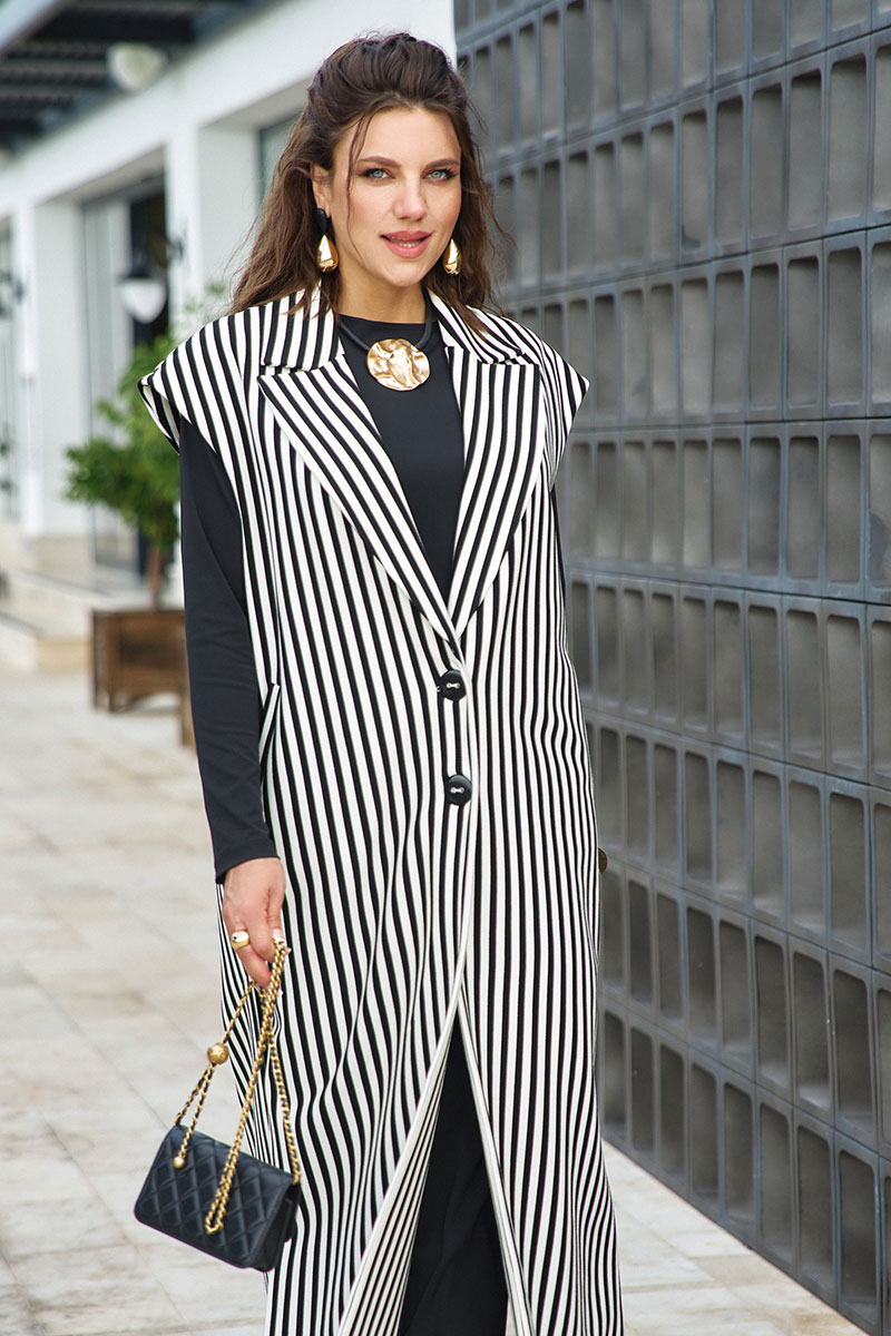 Как отдельная единица гардероба жилет миди в чёрно‑белую полоску — это минимализм с характером: он диктует ритм, задаёт форму и оставляет место для вашей интерпретации. Чёрно‑белая полоска — не просто орнамент, а ритм. Вертикальные полосы удлиняют фигуру, горизонтальные — играют с пропорциями. Наденьте его — и мир уже реагирует на новый аккорд вашего стиля. Жилет прямого силуэта, длины «миди», свободный с отложным воротником пиджачного типа и застёжкой на декоративные пуговицы по борту. Линия плеча спущенная, в боковых швах высокие разрезы. По переду жилета прорезные карманы с листочкой. Спинка со средним швом. Жилет на подкладке. За счёт вертикальной полоски силуэт визуально вытягивается, делая образ более стройным.